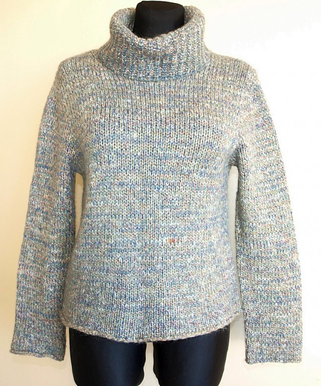 Golf marki Gara tkany z wielobarwnej przędzy. Materiał 44% wełna, 55% akryl 1% poliamid. Milutki i miękki w dotyku. Wykończenie bez ściągaczy. Stan bardzo dobry. Z przodu w jednym miejscu nadmiar brązowych nitek tworzy ciemniejszy punkt. Brak metki z rozmiarem. Podaję wymiary mierzone na płasko;