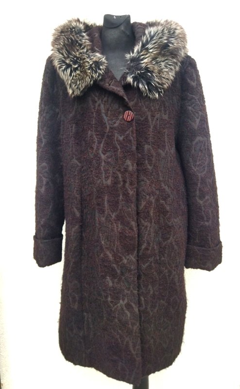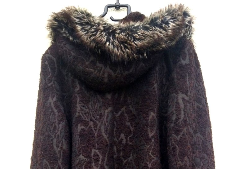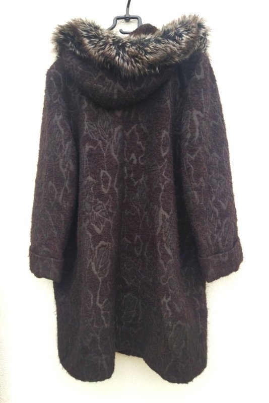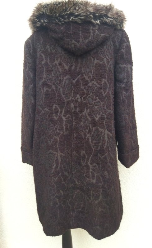 Ciepły płaszcz z dobrej jakości tkaniny z wypukłym wzorem o pętelkowym splocie w kolorze gorzkiej czekolady. trapezowy fason z kapturem z dopinanym kołnierzem ze sztucznego futerka, z dwiema wpuszczanymi kieszeniami. Zapinany na zewnątrz na dwa guziki u góry , reszta od wewnątrz . Całość na podszewce. Ładniejszy w realu