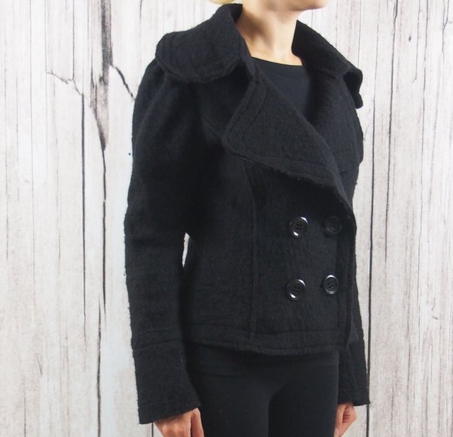 Krótki płaszczyk z filcowanej wełny i akrylu. Zapinany na duże guziki. Produkcji włoskiej.
