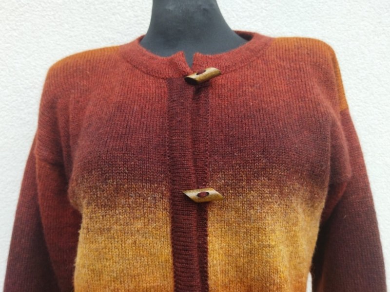Sweter typu kardigan z wełnianej włóczki z efektem ombre w brazowo-rudej kolorystyce. Zapinany na guziki kołki z drewna tekowego. Ciepły i bardzo lekki .
