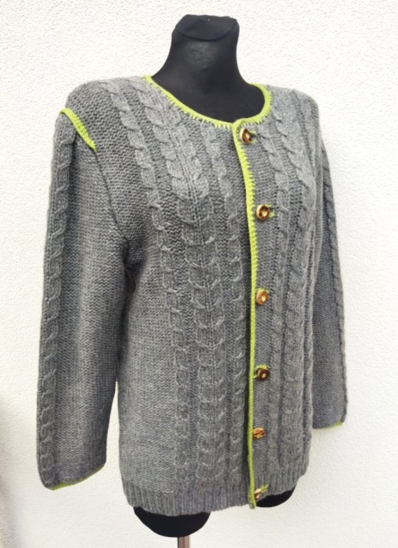 Ciepły rozpinany sweter typu kardigan z wełnianej włóczki w szarym kolorze, dziergany na drutach, wykończony szydełkiem włóczką w kolorze groszkowej zieleni. Zdobiony warkoczowym wzorem. zapinany na guziki.