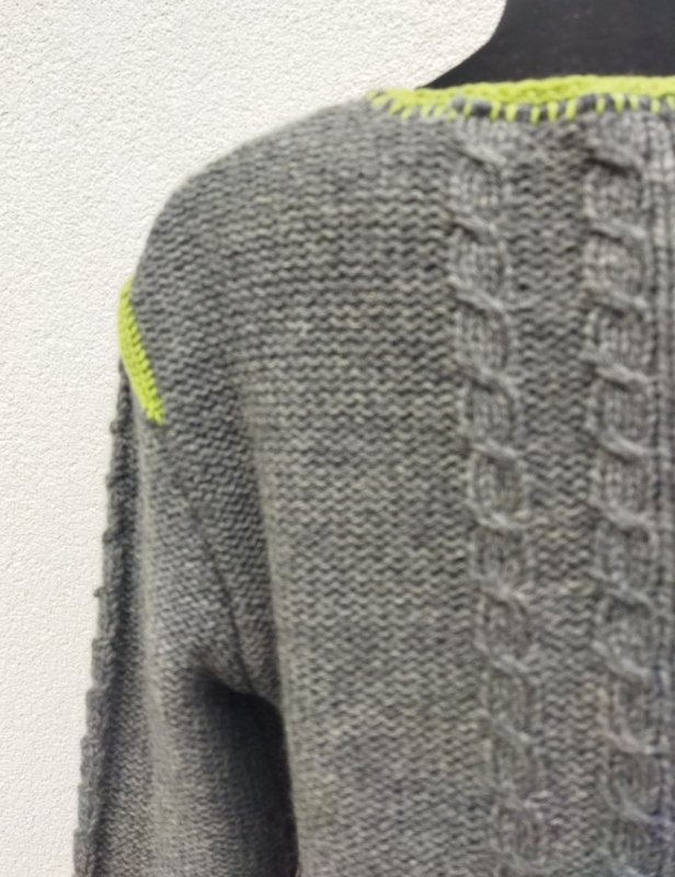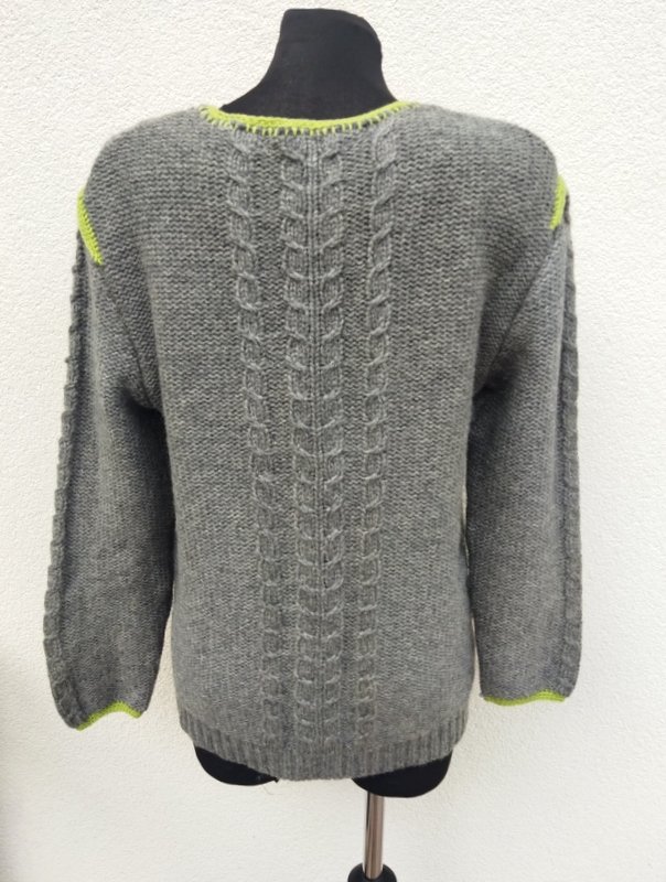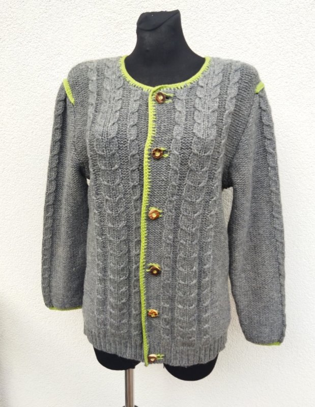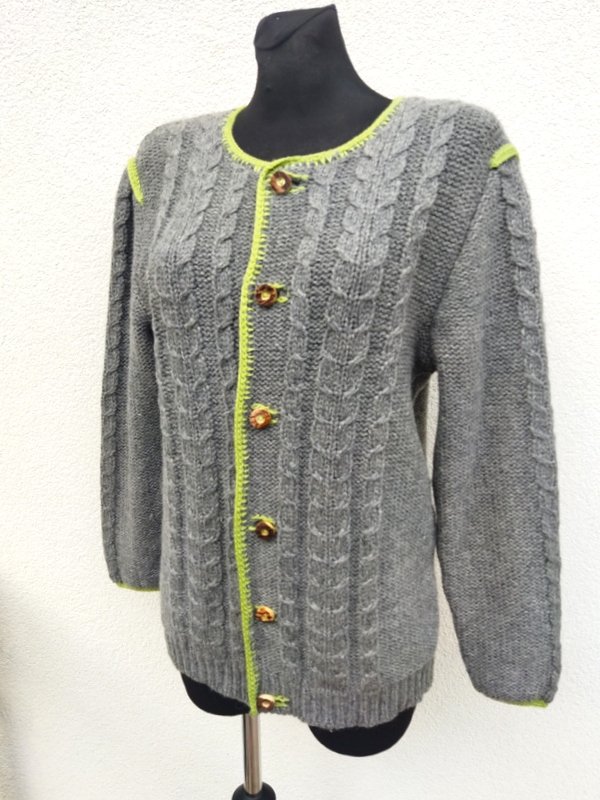 Ciepły rozpinany sweter typu kardigan z wełnianej włóczki w szarym kolorze, dziergany na drutach, wykończony szydełkiem włóczką w kolorze groszkowej zieleni. Zdobiony warkoczowym wzorem. zapinany na guziki.