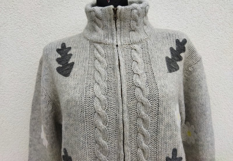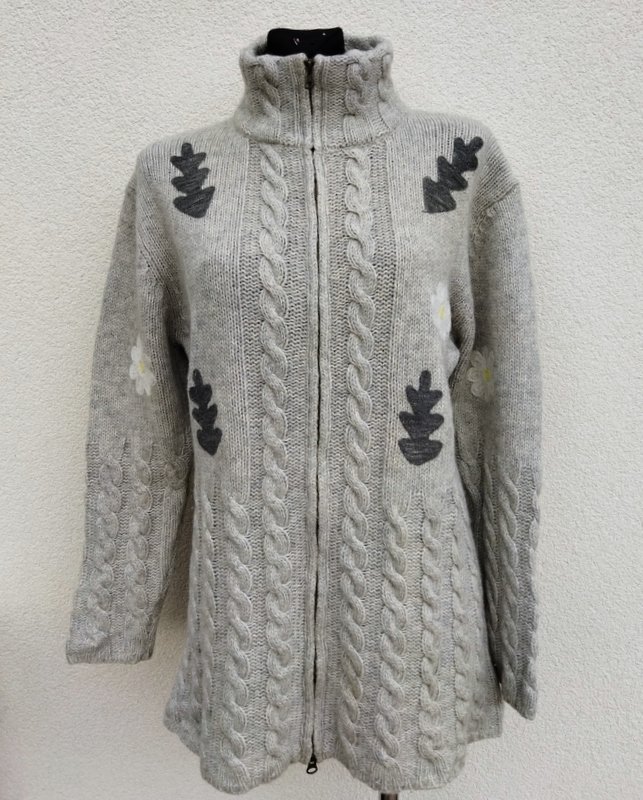 Miły mięciutki sweter z wełnianej niegryzącej włóczki w melanżowym jasnoszarym kolorze., z warkoczowym wzorem i kwiatowym haftem w białym i szarym kolorze. Zapinany na dwustronny zamek.