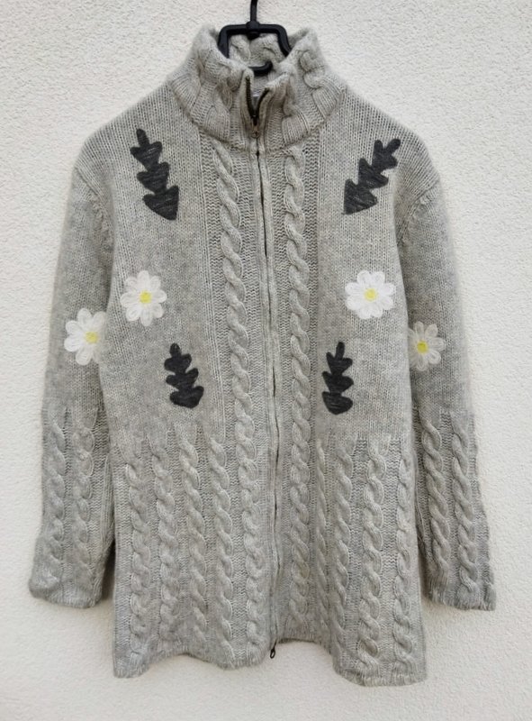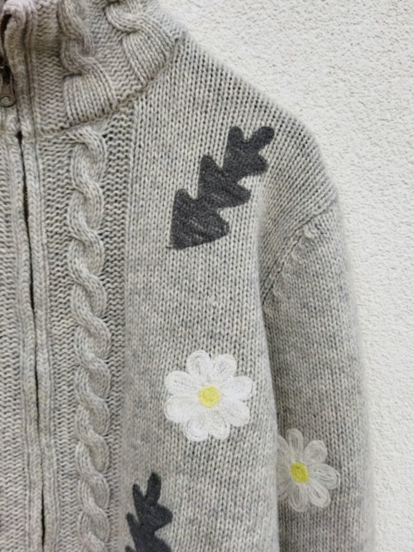 Miły mięciutki sweter z wełnianej niegryzącej włóczki w melanżowym jasnoszarym kolorze., z warkoczowym wzorem i kwiatowym haftem w białym i szarym kolorze. Zapinany na dwustronny zamek.