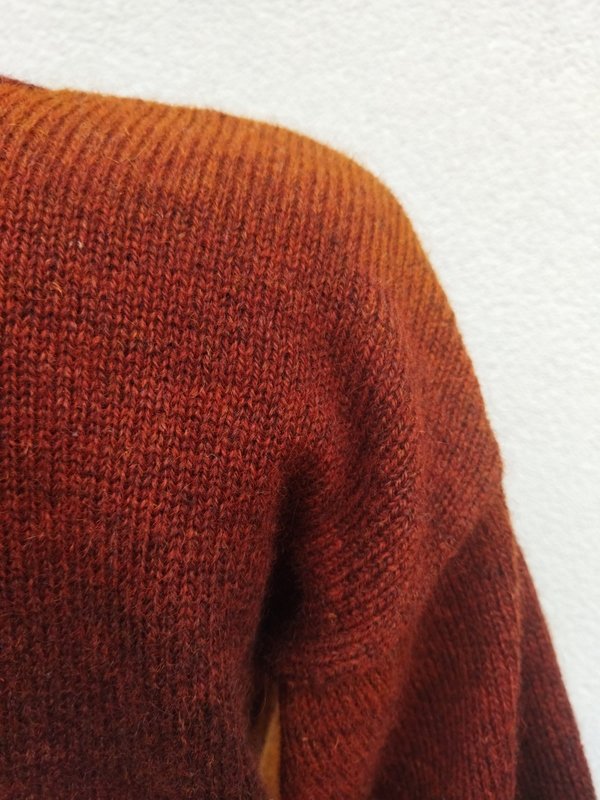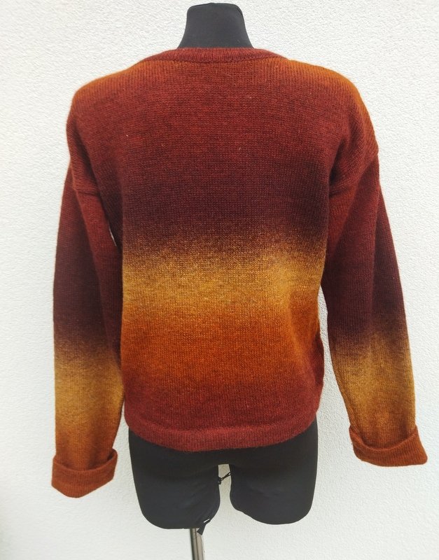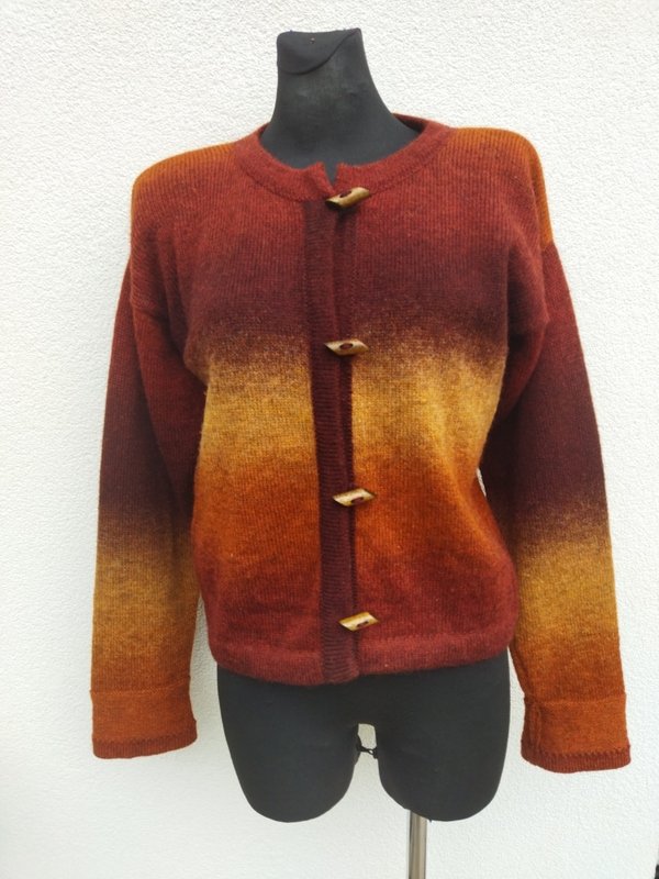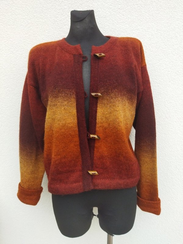 Sweter typu kardigan z wełnianej włóczki z efektem ombre w brazowo-rudej kolorystyce. Zapinany na guziki kołki z drewna tekowego. Ciepły i bardzo lekki .