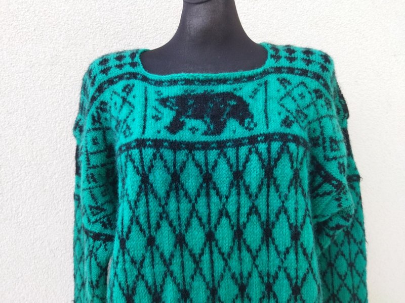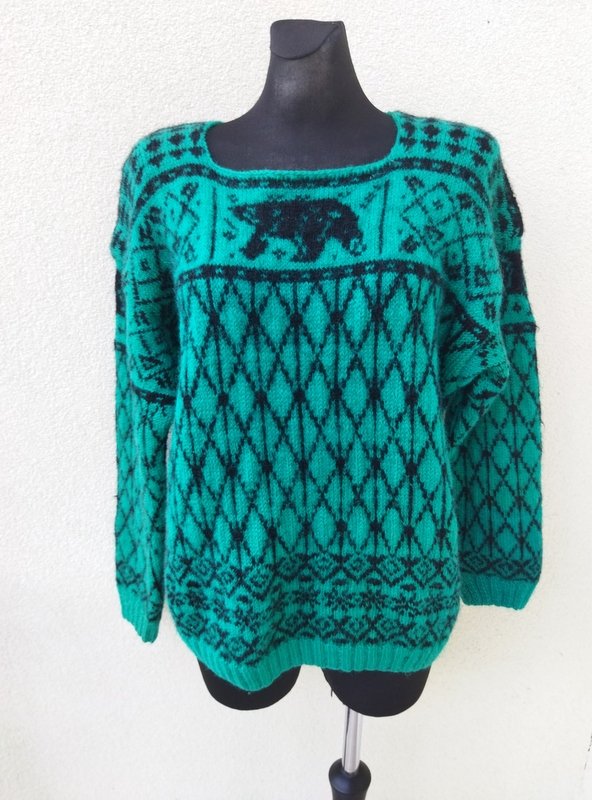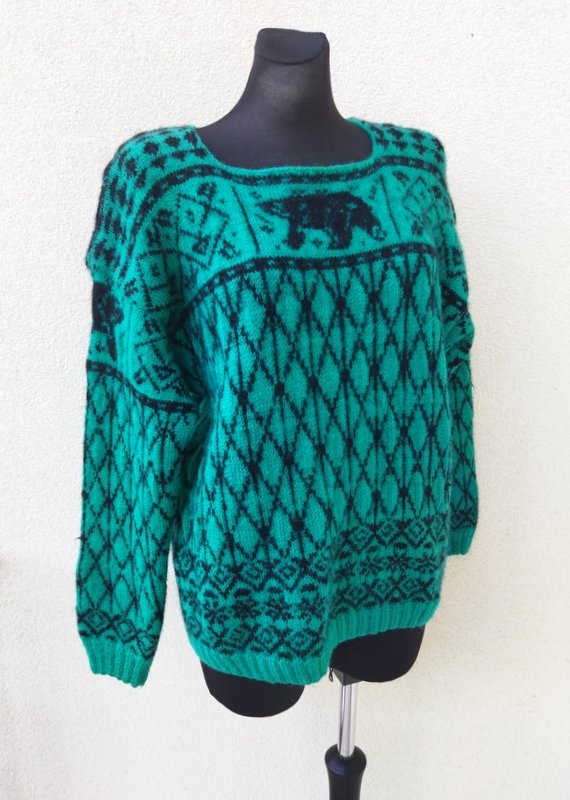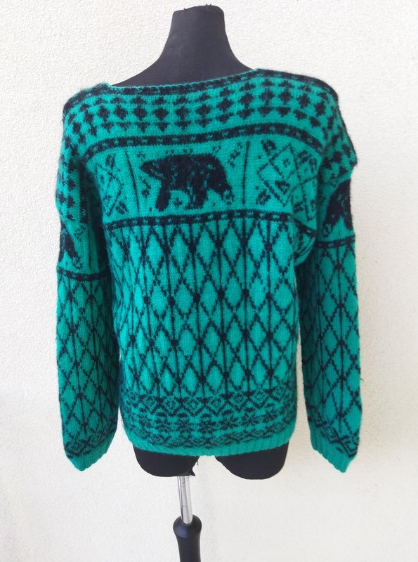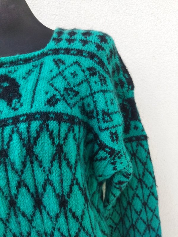 Ciepły wełniany sweter w kolorze soczystej morskiej zieleni z czarnymi wzorami. wykończony ściągaczami