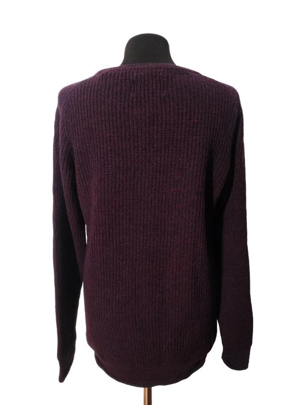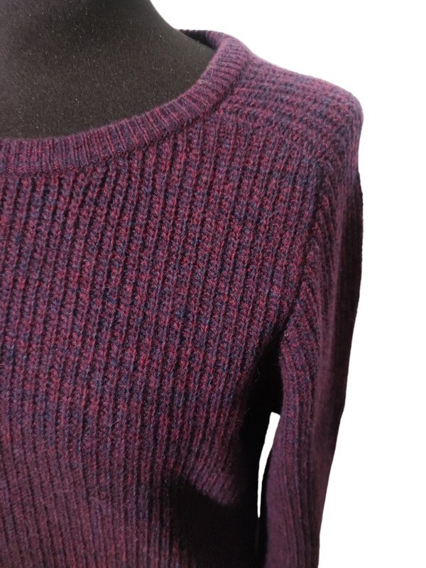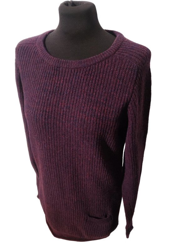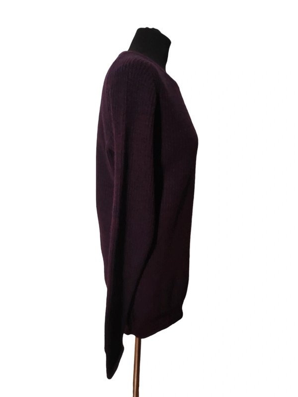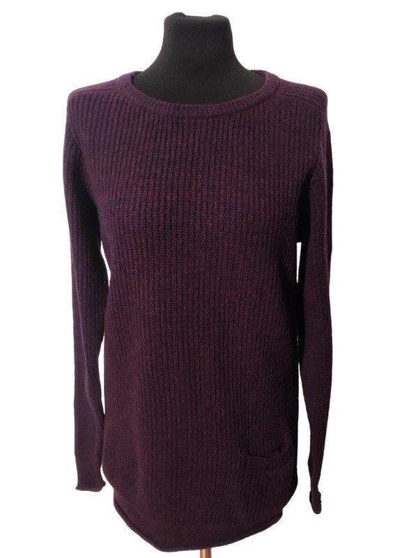 Wełniany sweter Vailent w pięknym fioletowo-bordowym kolorze. Klasyczny krój z małą kieszonką na przodzie. Ciepły, miękki i przyjemny w noszeniu. Stan bardzo dobry, brak wad. Idealny na chłodniejsze dni, świetnie układa się na sylwetce.