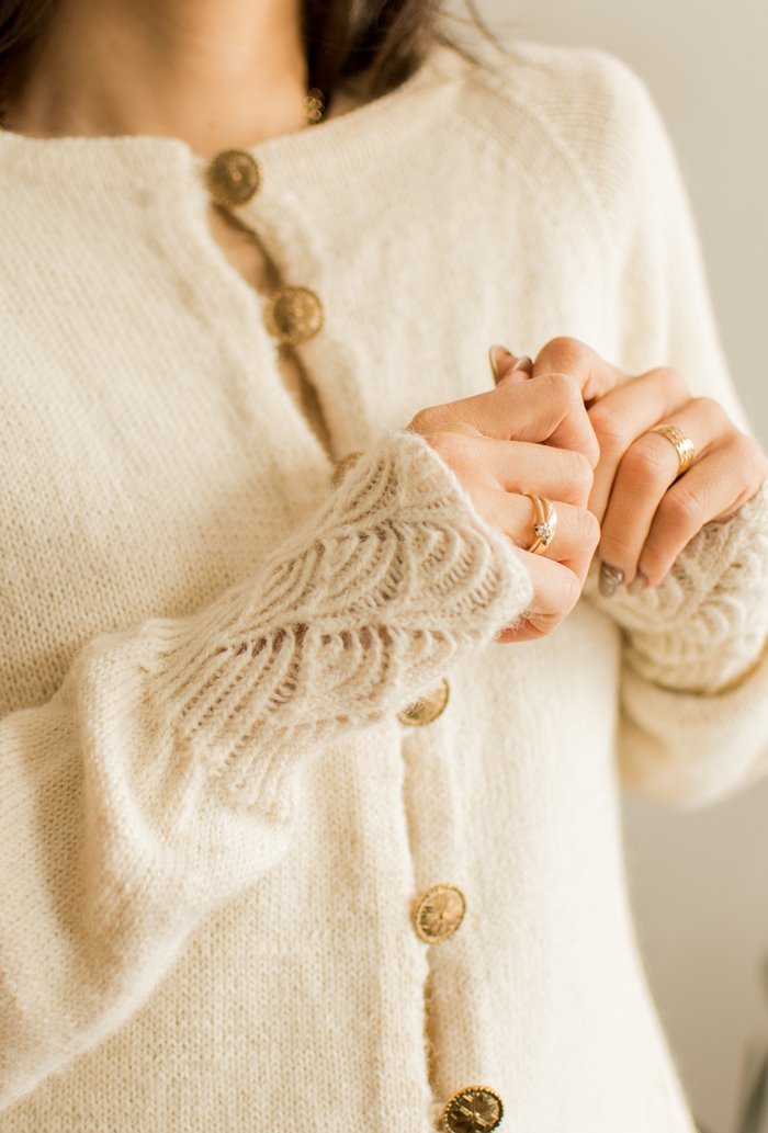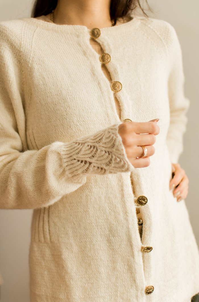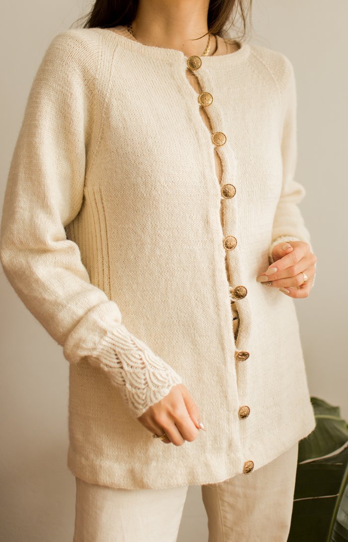 Wełniany sweter vintage, ze złotymi guzikami i ciekawymi mankietami.