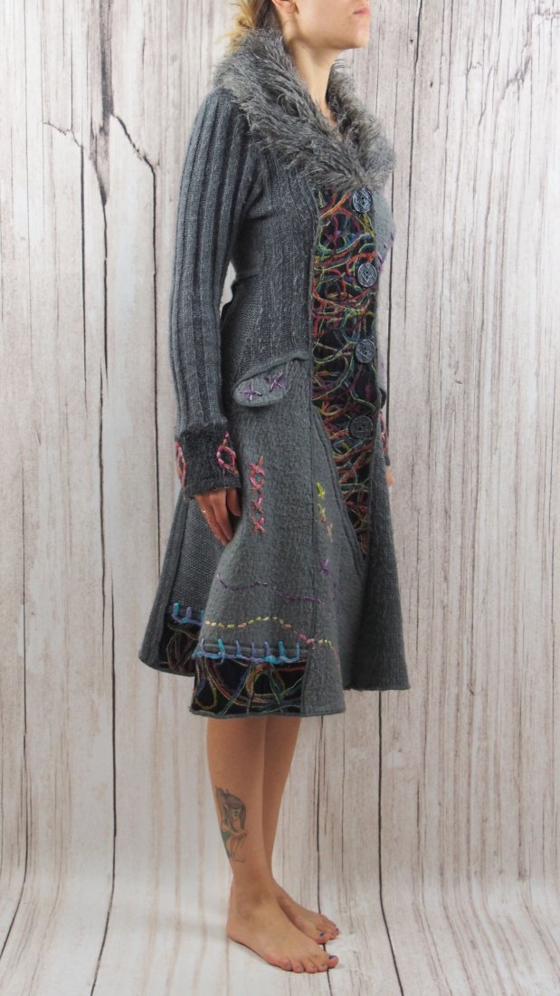Designerski wełniany swetro-płaszczyk. Sweter zrobiony na drutach, zdobienia z nałożonej filcowanej wełny (taki jakby baranek milutki w dotyku)