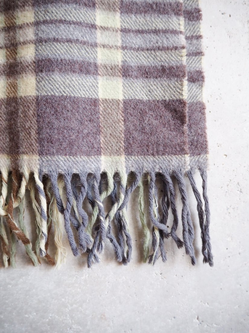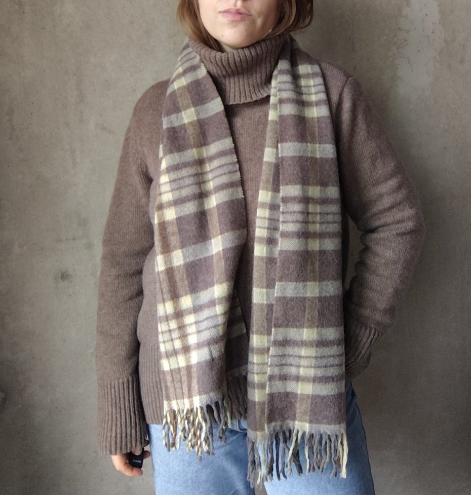 Piękny wełniany szalik w kratę w ciepłej stonowanej kolorystyce.
