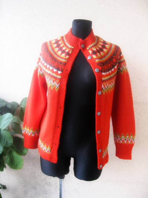 Ciepły sweter vintage wykonany techniką bezszwową, a dodatkowo z wzorem. Nie ma szwów bocznych, ani w rękawach. Brak jakichkolwiek metek. Na pierwszy rzut oka wygląda jak zrobiony przez kogoś, ale myślę, że jest to jednak wykonanie maszynowe. Materiał prawdopodobnie wełna, trochę sztywna i trochę drapiąca, jak wełna owcza, może trochę sfilcowany, ale nie jestem pewna. Ciekawy okaz vintage. Odcień czerwieni może być trochę inny niż na zdjęciach. Powinien pasować na 36. Podaję wymiary mierzone na płasko;