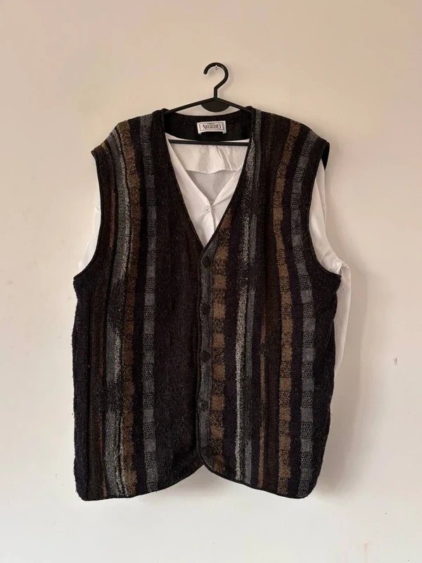 #vest #wool #woolblend #merinowool #classic #retrostyle #preppylook #layering #warmvest #knitvest #vintageclothing #oldmoneyaesthetic #menfashion #unisexfashion #smartcasualwear #brownvest #stripedknit #cozystyle #heritageclothes #winterfashion #fallfashion #streetstyle #casualwear #timelessfashion #menswear #europeanvintage #italianbrand #uniqueitem #secondhandfashion