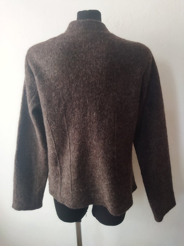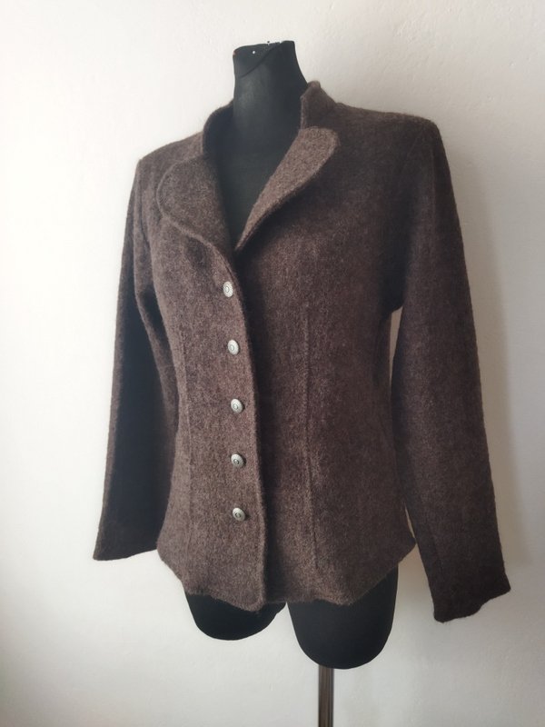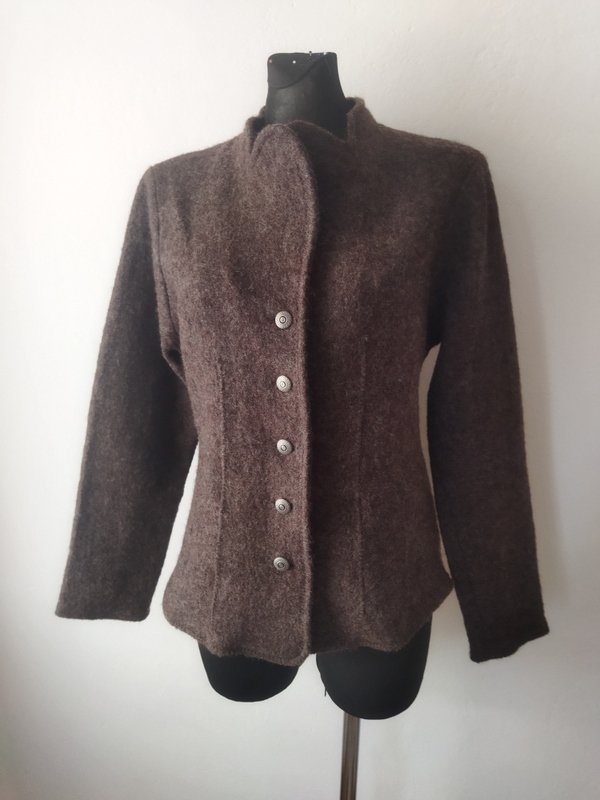 Zgrabny żakiet z wełnianej tkaniny dzianinowej w melanżowym ciemnobrązowym kolorze ( gorzka czekolada). zapinany na metalowe grawerowane guziki w srebrnym kolorze . Bez podszewki