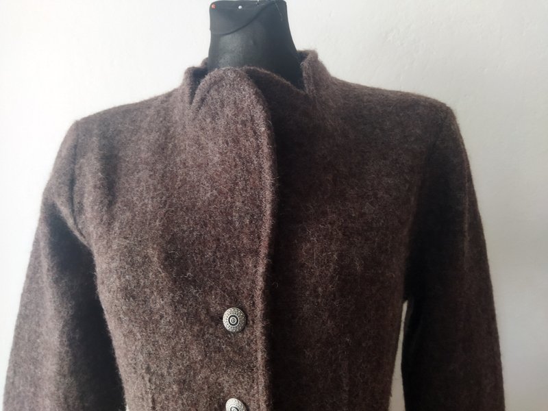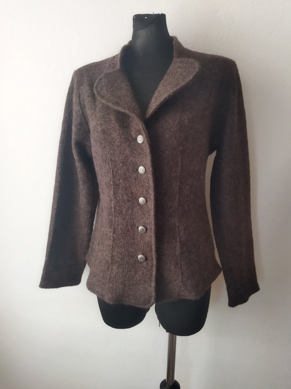 Zgrabny żakiet z wełnianej tkaniny dzianinowej w melanżowym ciemnobrązowym kolorze ( gorzka czekolada). zapinany na metalowe grawerowane guziki w srebrnym kolorze . Bez podszewki