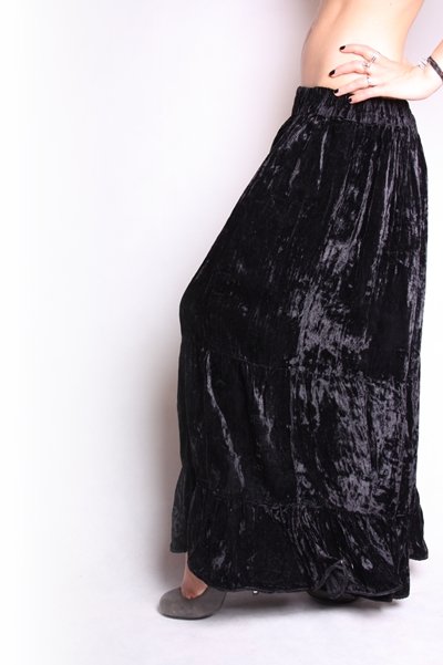 Czarna długa spódnica z mięciutkiego weluru. W pasie guma.,szer.bez rozciagania2x30cm.,rociagniecie max.2x51cm.,dl.calkowita 88cm.......................................B,