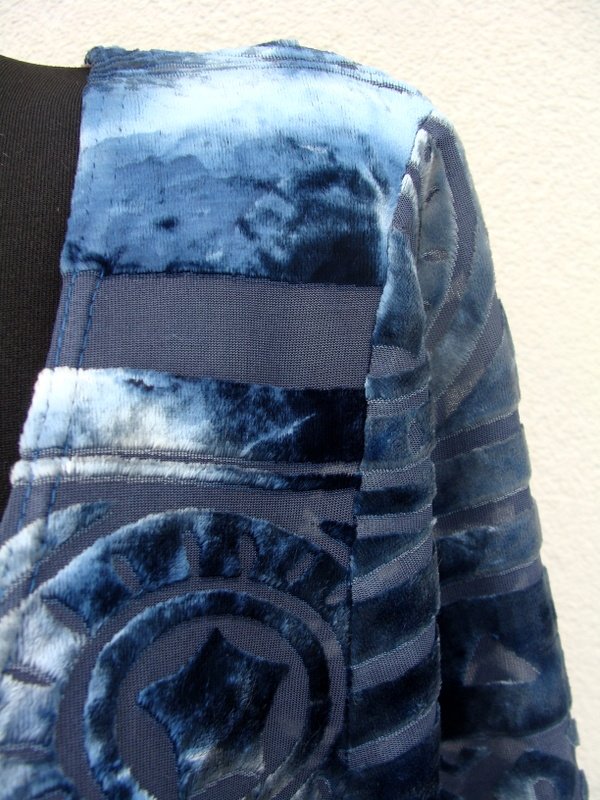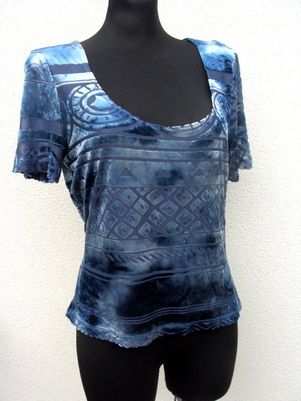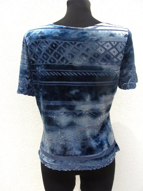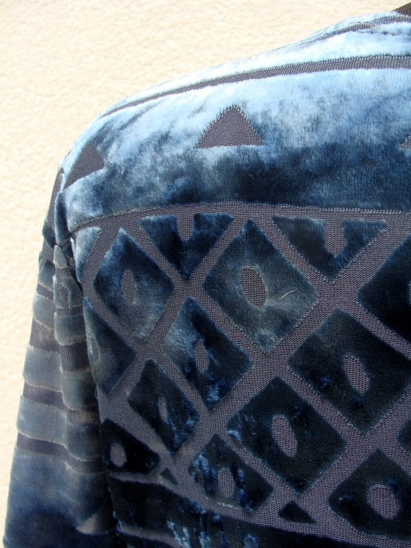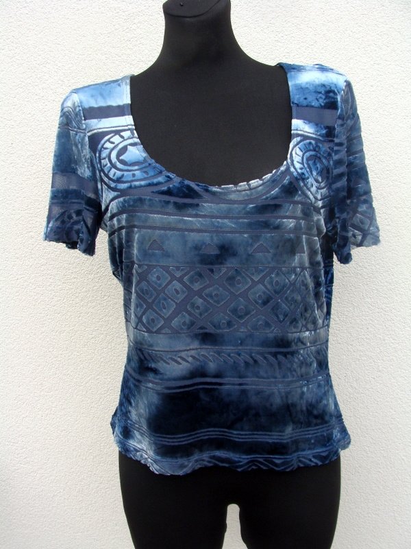 Ciekawa bluzeczka z reliefową welurową fakturą w geometryczne wzory w mieniących się odcieniach koloru niebieskiego na siateczkowym tle.