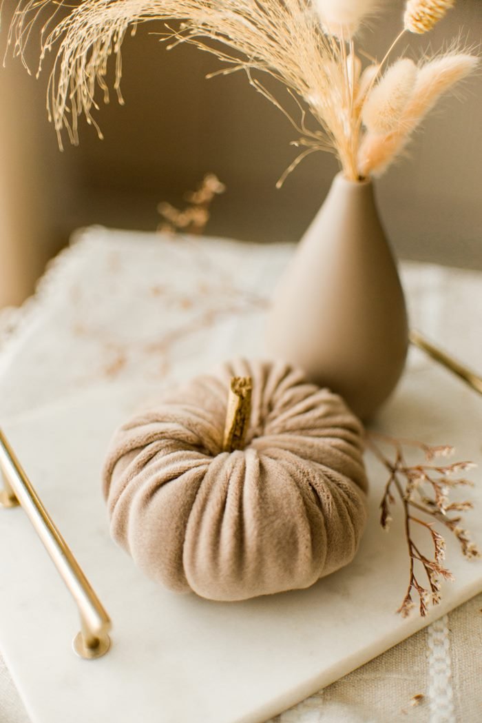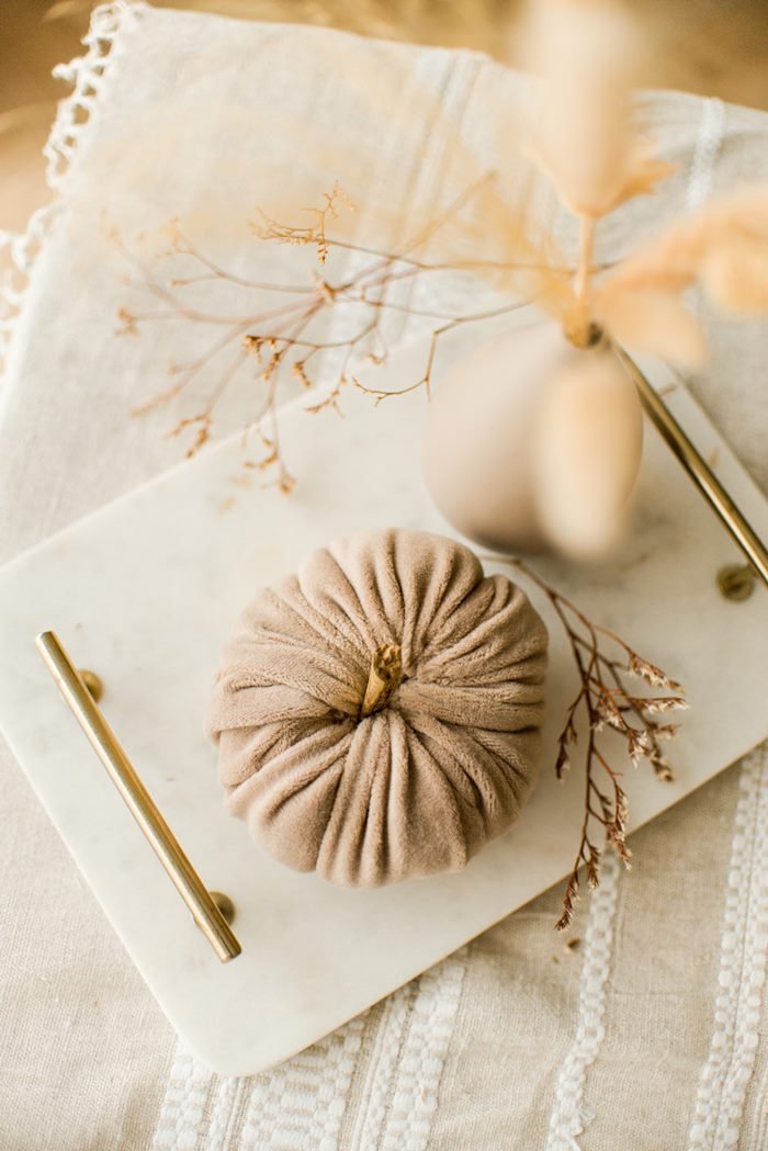 Welurowa dynia z drewnianym, złotym ogonkiem.