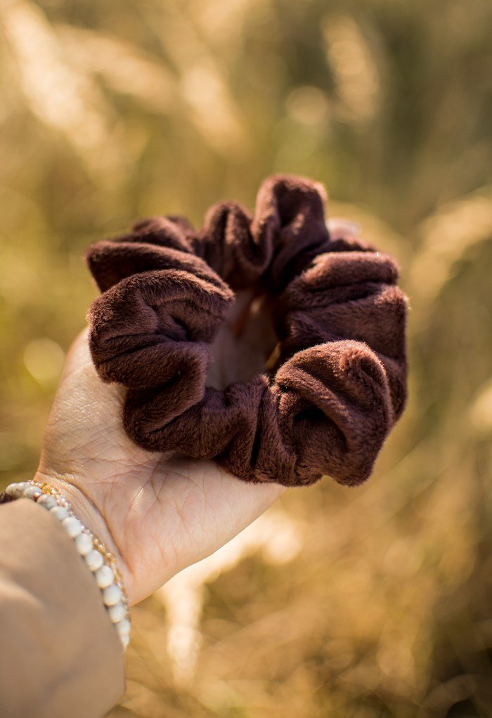 Welurowa gumka w odcieniu czekoladowym. Miła w dotyku.