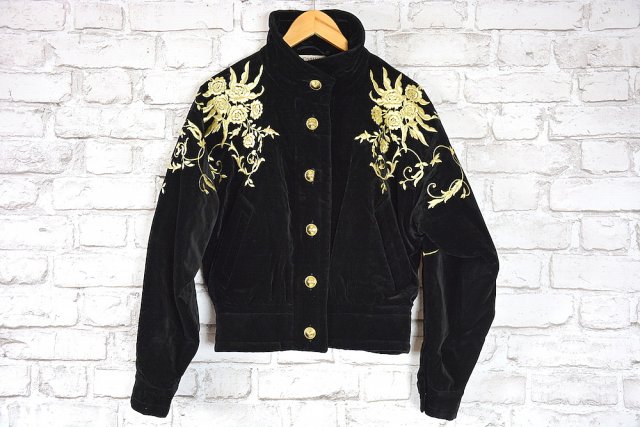 Ta kurtka to niesamowity rarytas, czarna krótka kurtka wykonana z grubszego weluru w wyszywane złotą nicią kwiaty z większym kołnierzem, zapinana na duże złote guziki (jeden zapasowy w środku ), po bokach kieszonki, całość na podszewce.