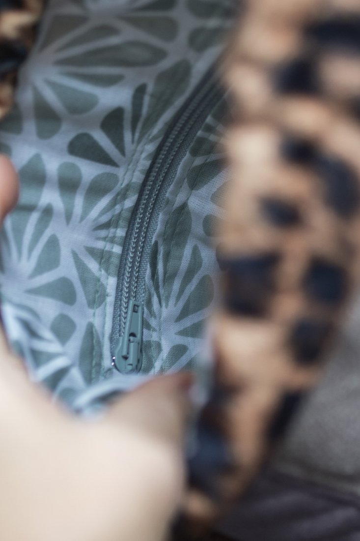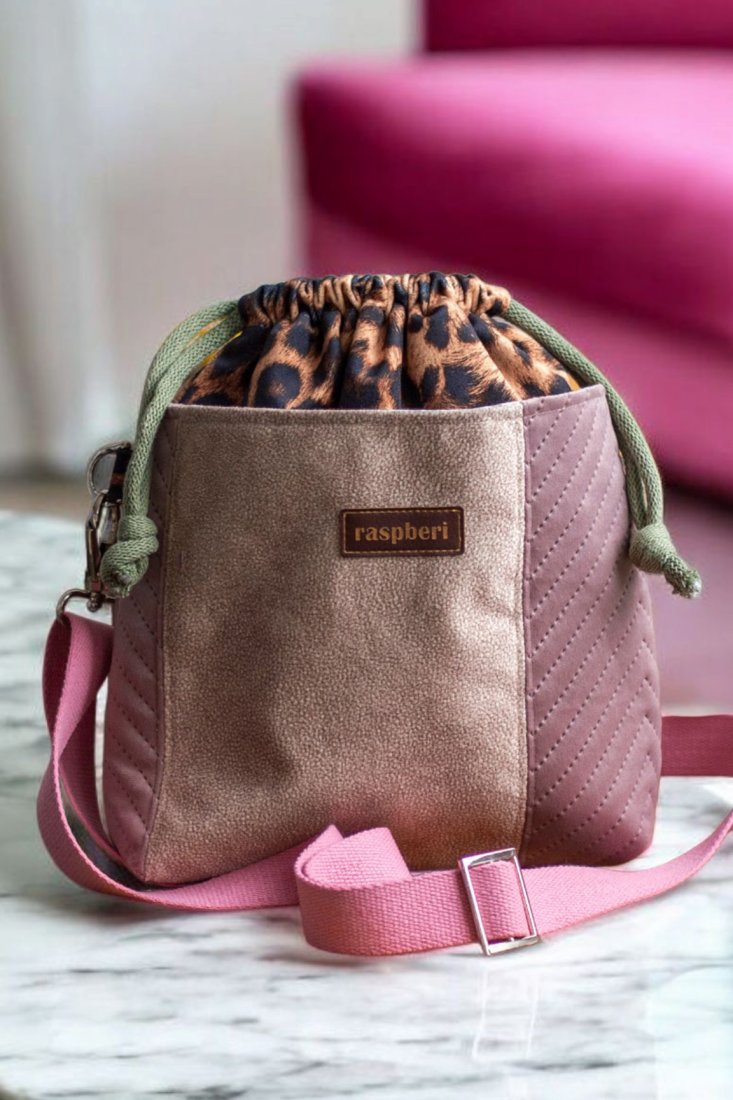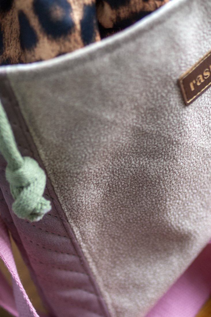 Wykonana z weluru w panterkę. Z przodu oraz z na tyle torebki kieszenie (np. na telefon czy chusteczki) z pudroworóżowego pikowanego weluru i weluru w kolorze beżowym. W środku kieszonka zapinana na suwak.