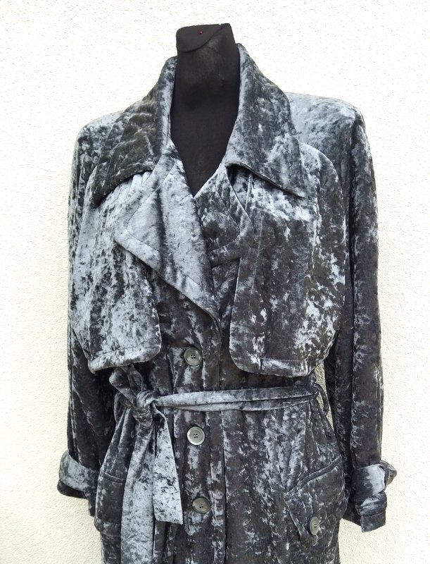 Płaszcz z welurowej tkaniny w kolorze ciemnej mięty mieniącym się w zależności od padającego światła. Z kołnierzem z rewersami, z pelerynką z przodu i z tylu, z raglanowymi rękawami, z dwiema wpuszczanymi kieszeniami z patkami na guzik, wiązany paskiem w talii. Zapinany na guziki. Całość na podszewce.