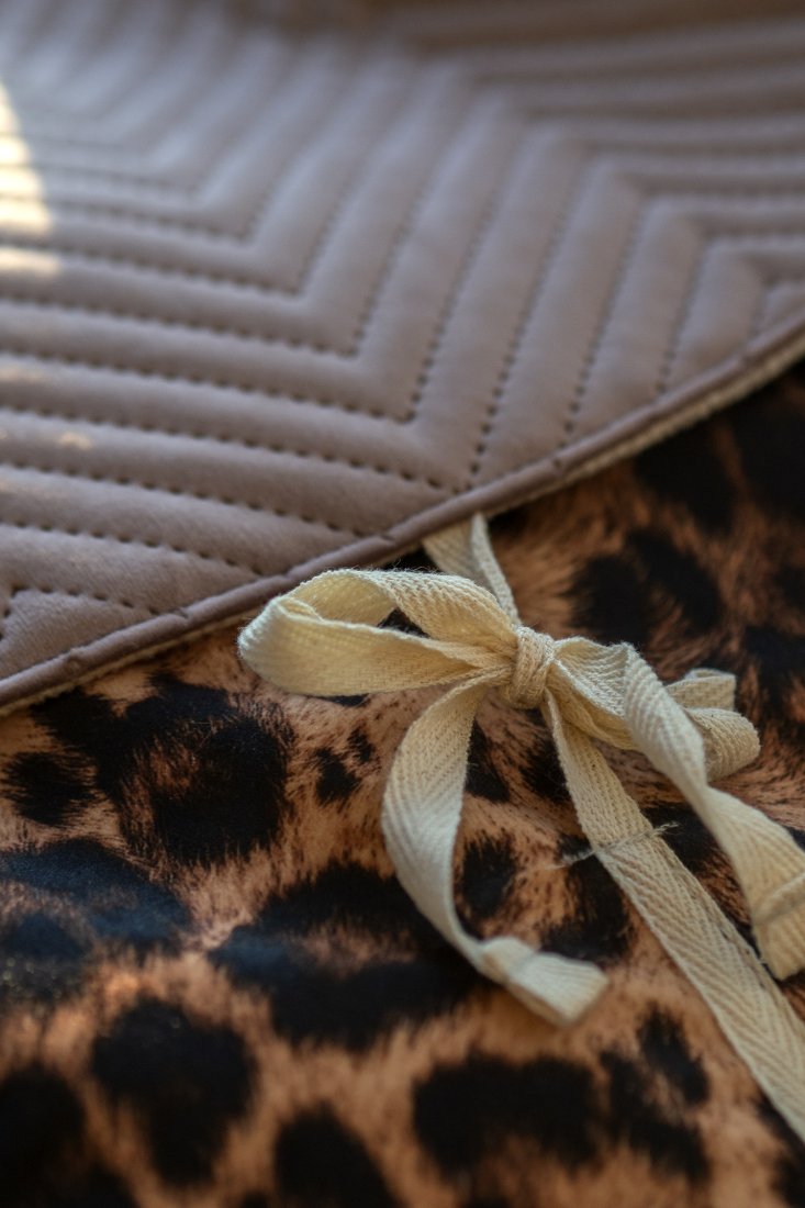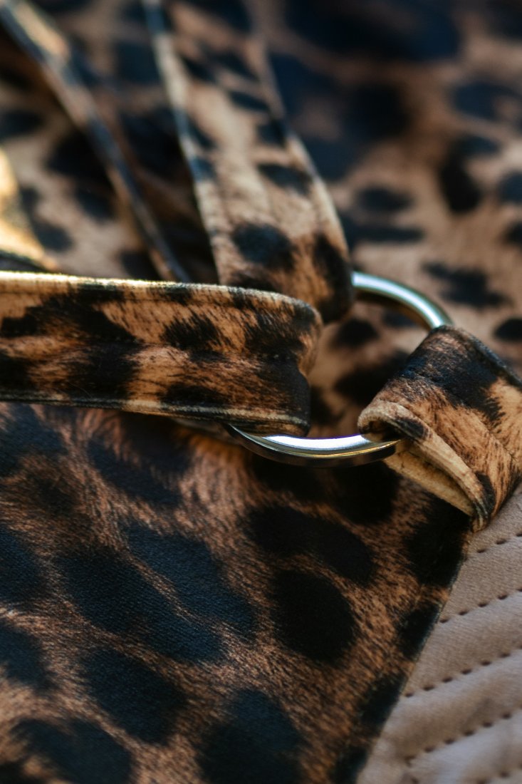 Plecak wykonany z weluru w panterkę z welurową, pikowaną klapą w kolorze brudnego różu.