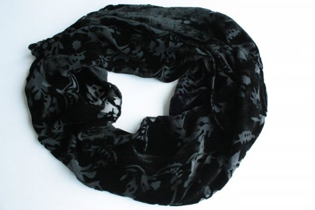 Elegancki, czarny szal wykonany prawdopodobnie z weluru.