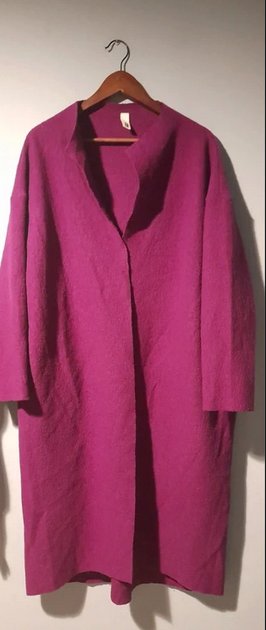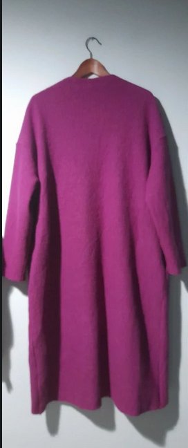 Narzutka płaszczyk piękny kolor w realu jak zbliżenie z metką i zdjęcie tyłu doskonały jakościowo materiał 100% vergine wool swobodny surowy fason rozmiar uniwersalny długość 110/115 tył szerokość bez zakładania brzegów 65x2 stan idealny