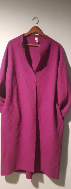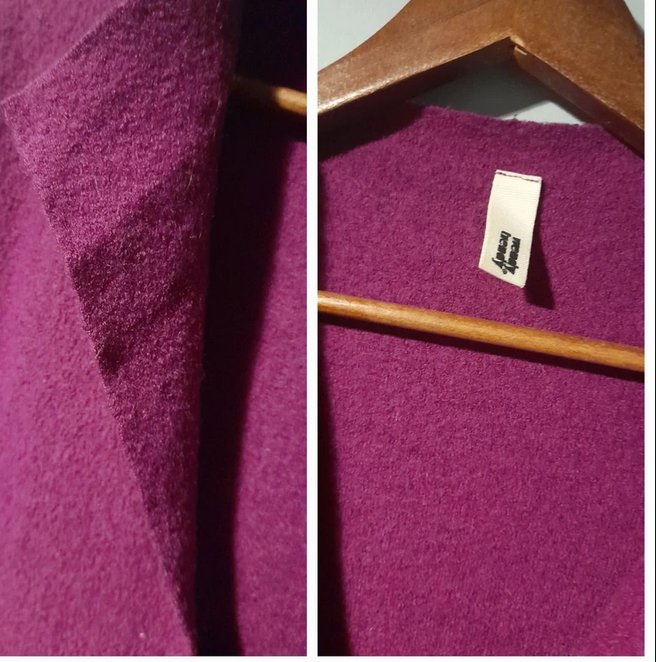 Narzutka płaszczyk piękny kolor w realu jak zbliżenie z metką i zdjęcie tyłu doskonały jakościowo materiał 100% vergine wool swobodny surowy fason rozmiar uniwersalny długość 110/115 tył szerokość bez zakładania brzegów 65x2 stan idealny