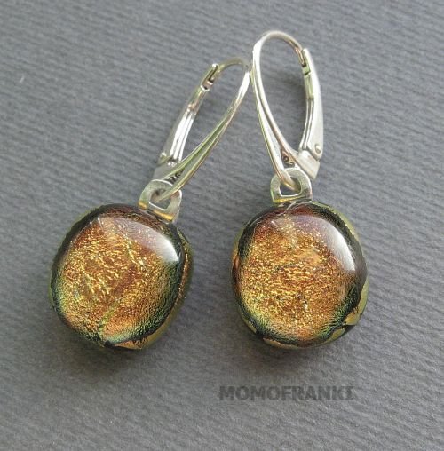 Szklane kolczyki własnego wypału, wykonane metodą fusingu. Błyszczą i przyciągają spojrzenie, pięknie opalizują na złoto - miedziano. Swą wyjątkową naturę zawdzięczają wtopionym tlenkom metali - złota, srebra, aluminium, chromu, tytanu, cyrkonu, magnezu i krzemu. Dzięki efektowi iryzacji mienią się, delikatnie zmieniając barwę i jej intensywność w zależności od kąta padania światła. Wymiary szkła ok 1,3x1,5cm. Długość wraz z biglem 3,4cm. Bigle angielskie, srebro 925. Zawieszki posrebrzane. Zostaną elegancko zapakowane. Zapraszam serdecznie :)