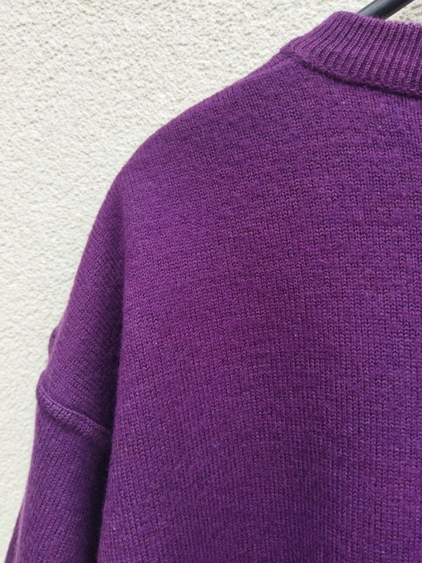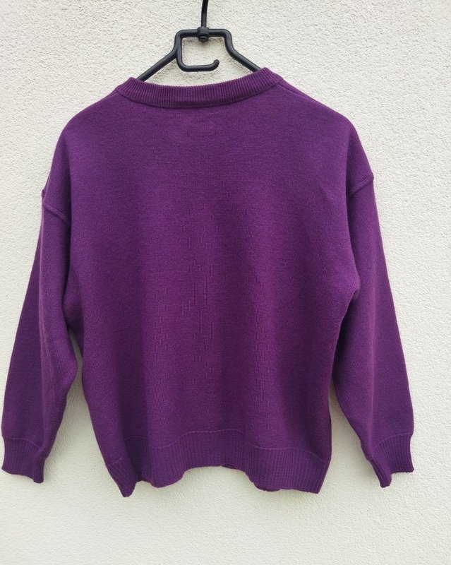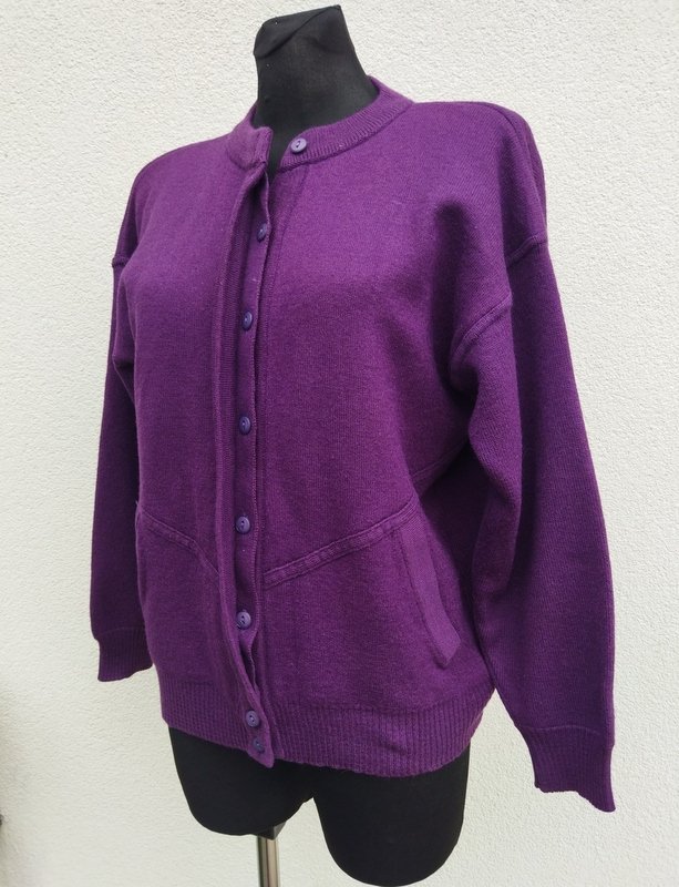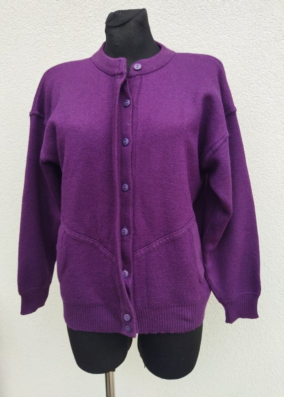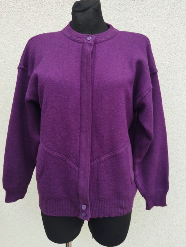 Dobrej jakości ciepły wełniano-akrylowy sweter w fioletowo-śliwkowym kolorze. Zapinany na guziki ukryte pod maskująca plisa , z dwiema wpuszczanymi kieszeniami, z obniżoną linią ramion. Wykończony ściągaczami. Może zastąpić wiosenną kurtkę.