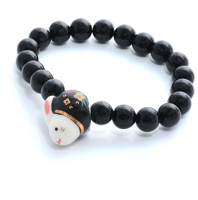 Zabawna, urocza bransoletka wykonana z kulek pięknego czarnego, błyszczącego onyksu (8mm) oraz ceramicznego uroczego króliczka.