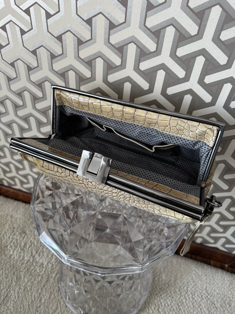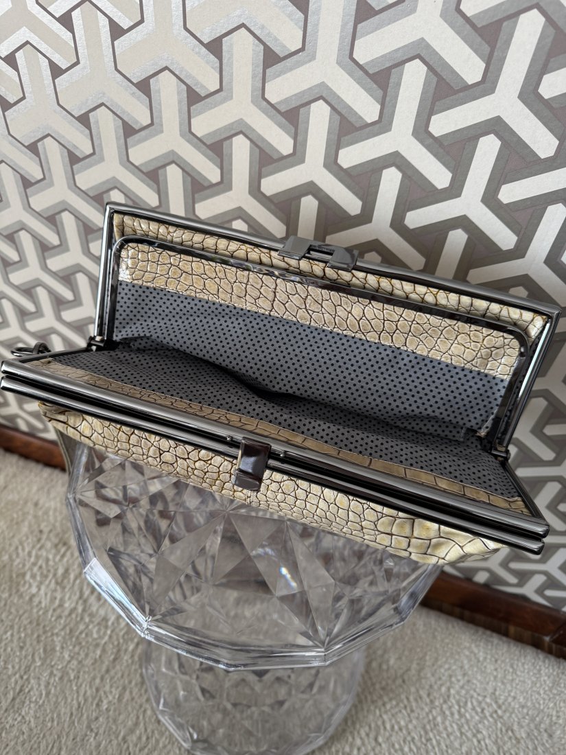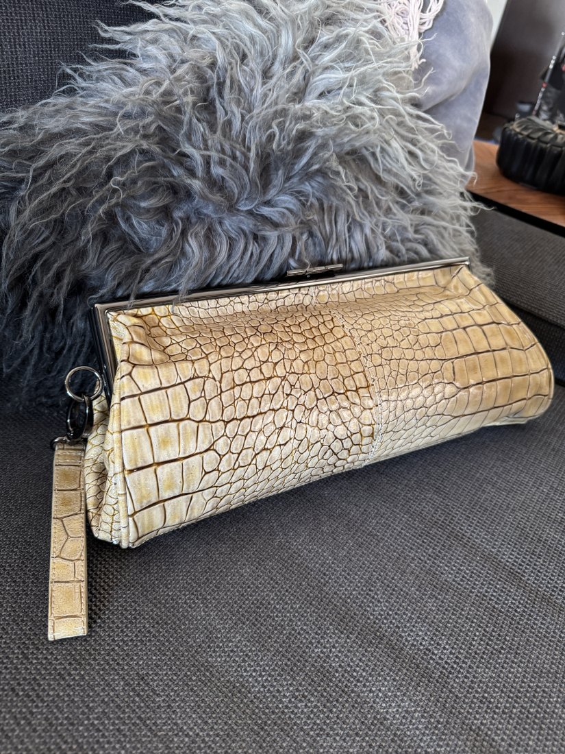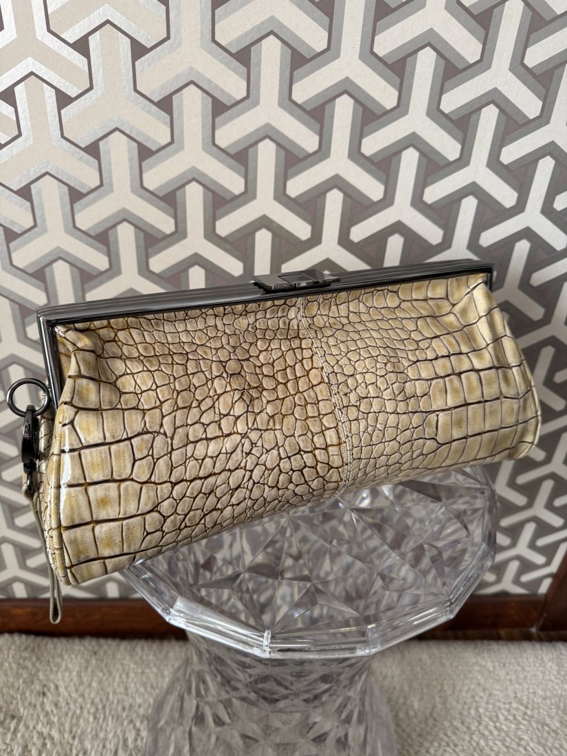 Wężowa, duża kopertówka brytyjskiej marki REISS, piękna lakierowana skóra, kolor śmietankowy ze złotymi błyskami. Bardzo porządne wykonanie, świetne zapięcie, trzy komory, kilka kieszonek.
