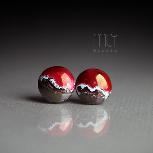 Ceramiczne okrągłe kolczyki w formie sztyftów, ręcznie wykonane z delikatnej gliny kamionkowej, jednostronnie szkliwione mieszanką brunatnych, czerwonych i białych szkliw z efektem plamek i pięknym iryzującym połyskiem, na antyalergicznych sztyftach w kolorze srebrnym. Średnica ok. 11mm. Polecam. Termin realizacji zamówienia to 1-2 dni.