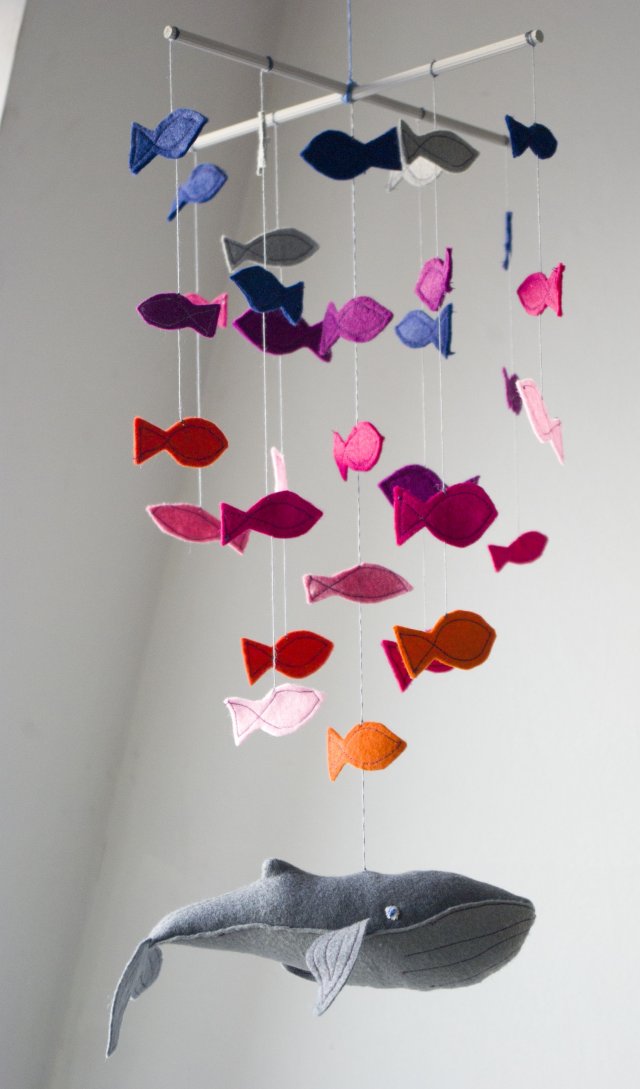 Morska ozdoba do dziecięcego pokoju - dostojny wieloryb wśród ławicy małych rybek, leciutko, lecz bez ustanku, poruszających się z prądem... powietrza. Cała zawieszka uszyta została z filcu (wieloryb z dwóch odcieni szarego, rybki - szarego, fioletowego, niebieskiego, pomarańczowego i różowego) i zawieszona na bukowym, malowanym stelażu. Wymiary dekoracji to: szerokość 25cm, wysokość 50cm. Wielkość wieloryba to około 23cm