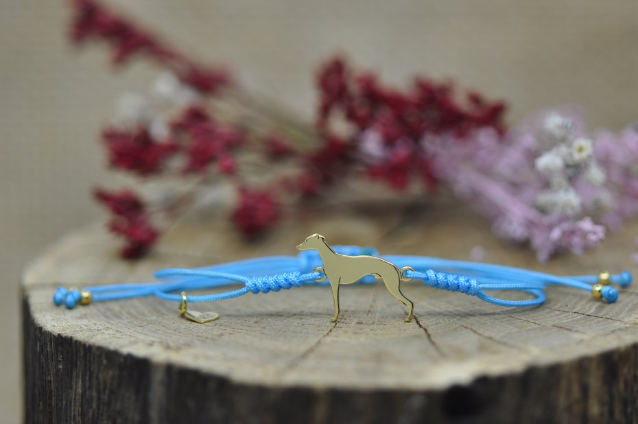 Whippet wykonany ze srebrnej blachy próby 925, wymiary pieska: 20 x 15 mm, grubość 0,8 mm oraz srebrne kulki.
