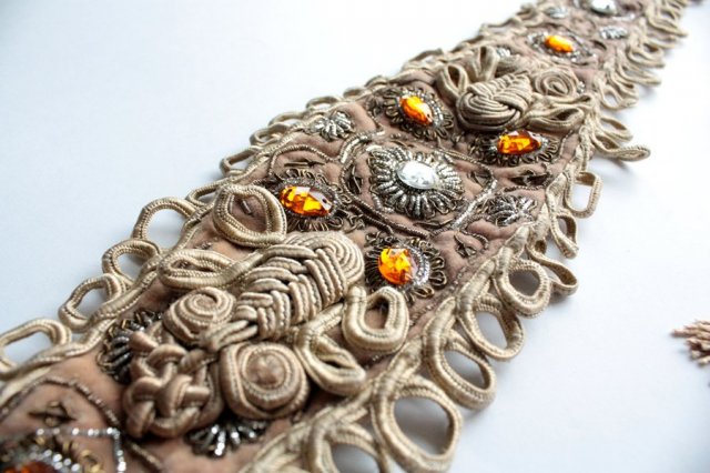 Pasek marki WHISTLES, wykonany z aksamiu, misternie ozdobiony sztucznymi kamieniami oraz haftami w kolorze starego złota i srebra przy pomocy metalowej nitki.