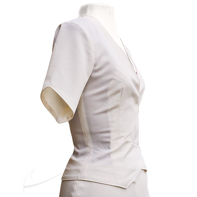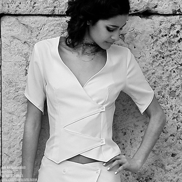 Projekt: bluzka dopasowana, zapinana kopertowo na dwa guziki.