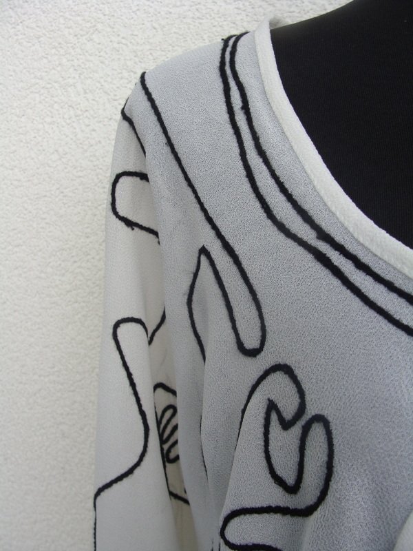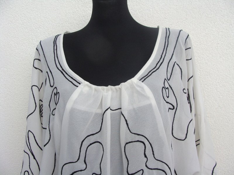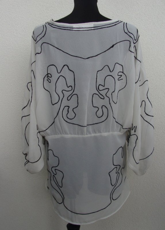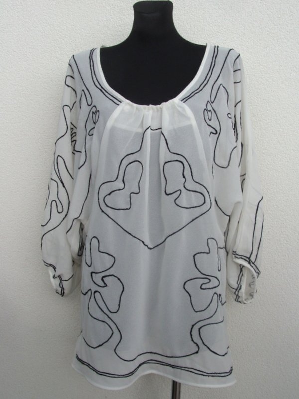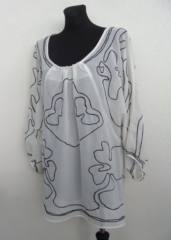 Biała, dłuższa bluzka/ tunika wyszywana czarną sznureczkową nicią w abstrakcyjne wzory. Ciekawie uszyta - rękawy bardzo szerokie z przodu raglanowe z tyłu wykrojone z całości materiału razem z plecami , dołem ujęte w wąski rulonik . Przód bluzki przy dekolcie lekko przymarszczony, tył lekko wmarszczony w dolną część bluzki.
