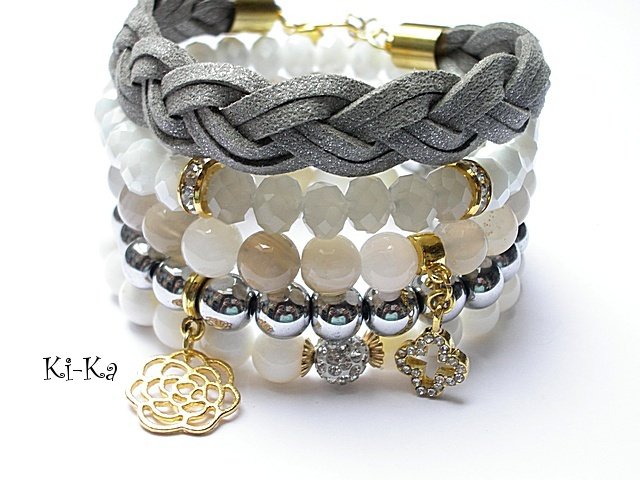 Komplet pięciu bransoletek wykonanych z naturalnych minerałów: hematytu [8mm], agatów botswana [8mm], muszli [8mm], kryształków [6 x 8mm], rzemienia z zamszowej, ekologicznej skórki, przekładki shamballa wysadzanej kryształkami Swarovskiego, przywieszki wysadzanej cyrkoniami, przekładek wysadzanych kryształkami oraz elementów metalowych w złotym kolorze. Bransoletki pasują na nadgarstek 15 - 16,5cm. Biżuteria ozdobnie zapakowana.