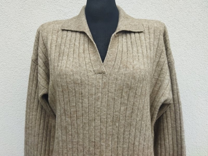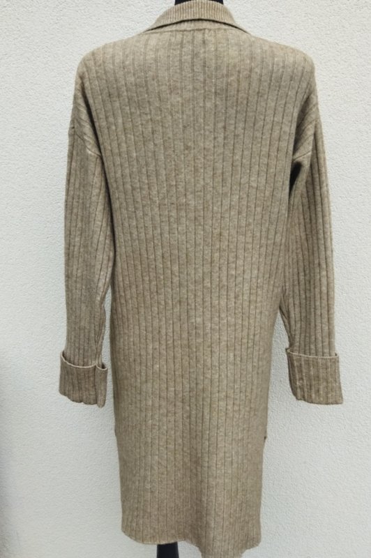 Miła, mięciutka dzianinowa sukienka z akrylu z domieszką w melanżowej kolorystyce cappuccino. Z kołnierzem, z małym rozcięciem pod szyją i rozcięciami u dołu po bokach, rękawy z odwijanymi mankietami, Asymetryczna - dłuższa z tyłu