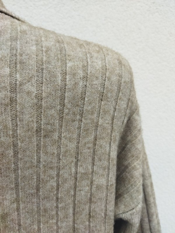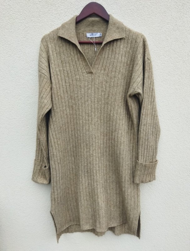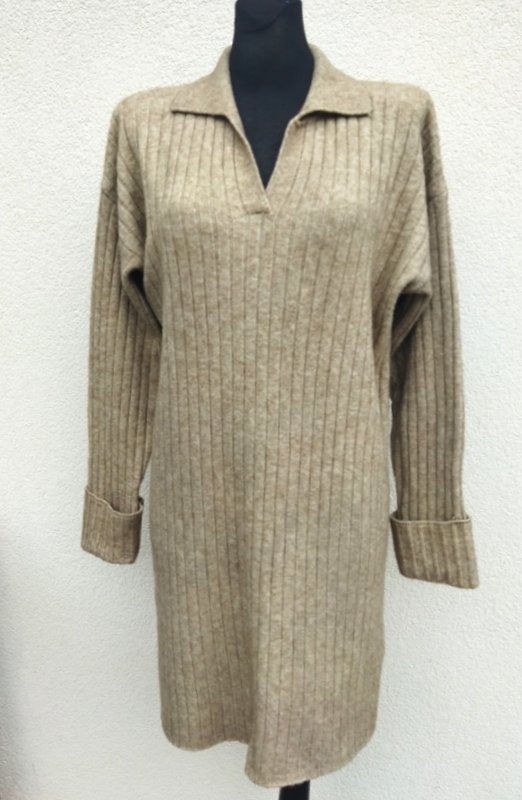Miła, mięciutka dzianinowa sukienka z akrylu z domieszką w melanżowej kolorystyce cappuccino. Z kołnierzem, z małym rozcięciem pod szyją i rozcięciami u dołu po bokach, rękawy z odwijanymi mankietami, Asymetryczna - dłuższa z tyłu