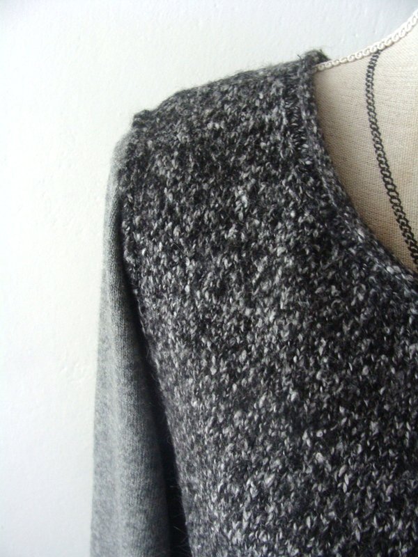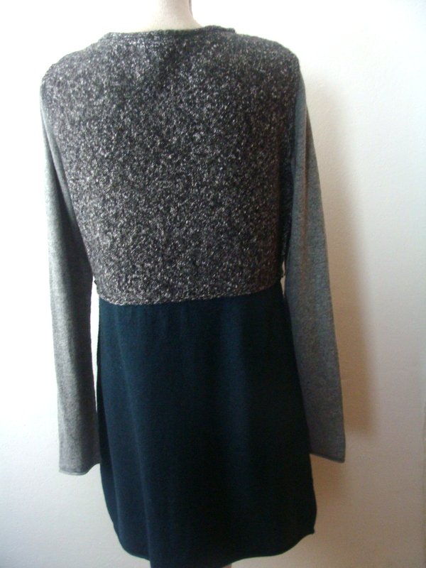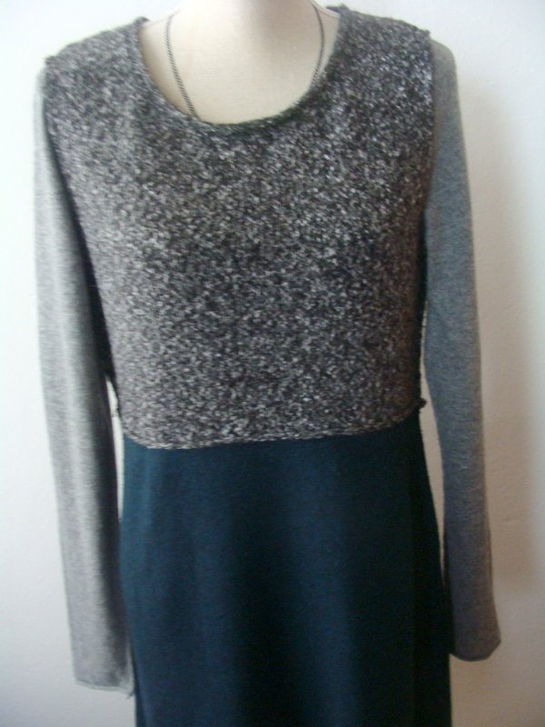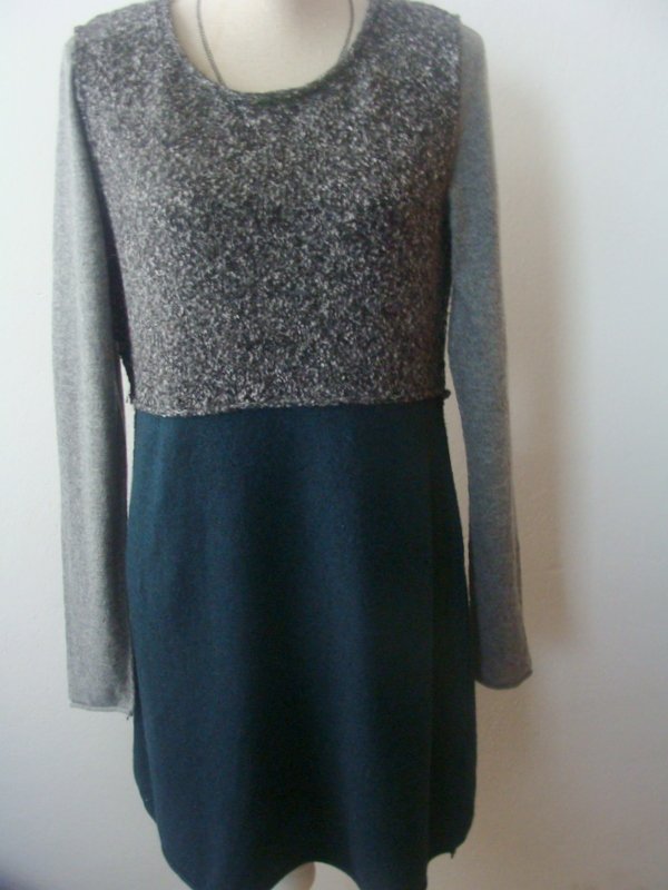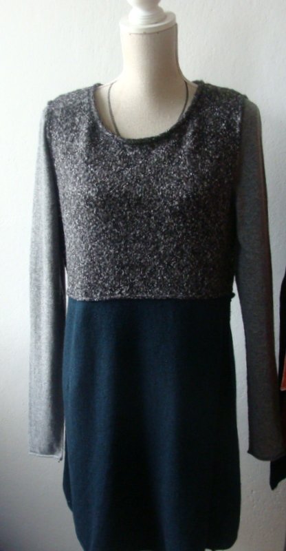 Dzianinowa sukienka  w trzech kolorach ; tułów z grubszej dzianiny w kolorystyce melanżu czerni ze złamana bielą ( sól i pieprz), dół z cieńszej w kolorze ciemnej morskiej zieleni, rękawy jasnoszare, szwy łączeniowe na zewnątrz. Owalny dekolt  z odwijaną pliską. Miła podatna i rozciagliwa.
