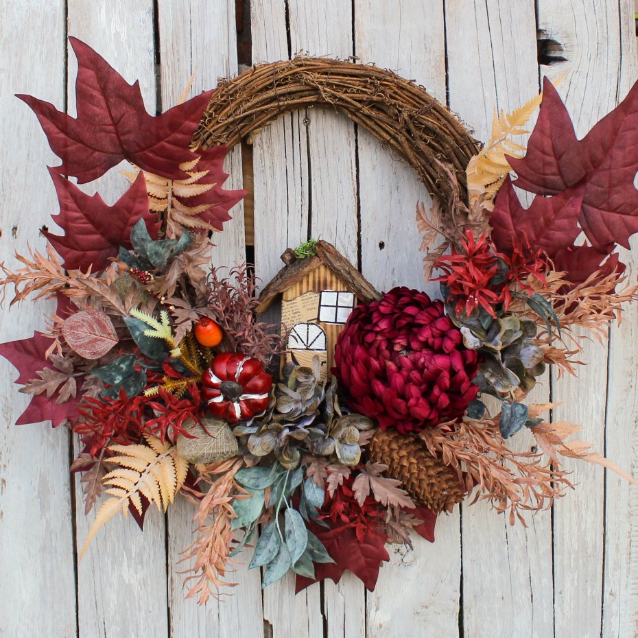 Wianek jesienny bogato zdobiony z uroczym domkiem. Wianek wykonany na rondzie o średnicy 35cm.