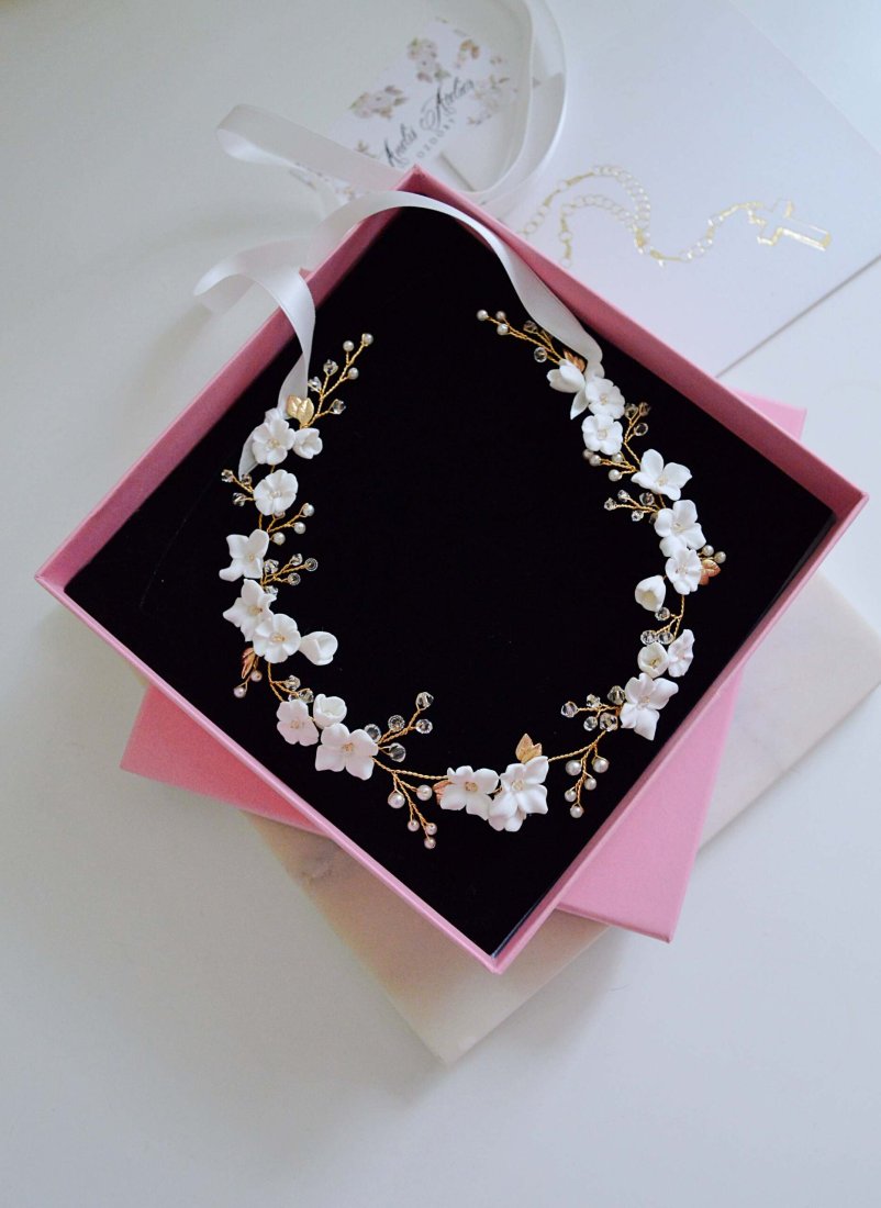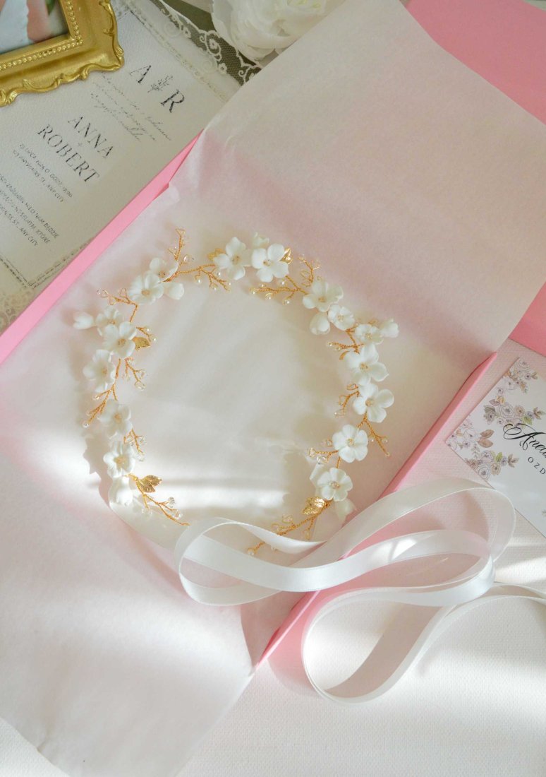Kwiecisty, bogato zdobiony wianuszek – gałązka. Wykonany z ręcznie formowanych kwiatków, kryształków bezbarwnych Swarovskiego, pereł Preciosa oraz złotych listków. Odcień złoty – miedziany, kwiatki oraz perły w kolorze białym o odcieniu ciepłym. Długość 35 cm. Wianuszek wiązany na dwustronne tasiemki białe szerokości 1 cm. Może być założony z tyłu, a także jako dekoracja warkocza czy upięcia.