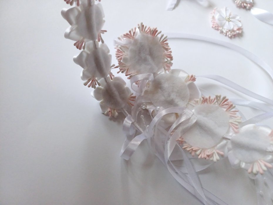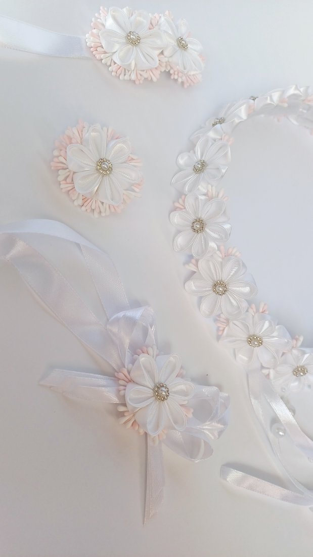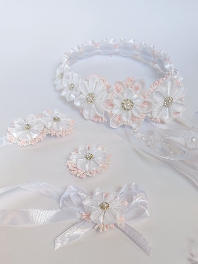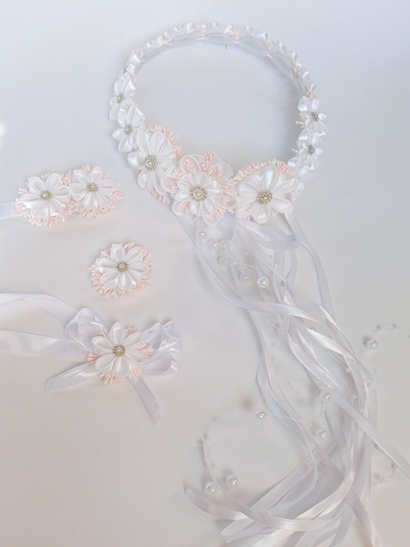 Piękny wianek komunijny plus ozdoby: na rękę, na świecę i na torebkę. Cały zestaw stworzyłam sama. Baza wianka - Kwiaty trzymają się na delikatnym, cienkim drucie owiniętym satynową białą wstążką. Wianek nie jest "zamknięty", dlatego można go delikatnie dopasować do obwodu głowy dziecka - wiązanie za pomocą wstążek. W komplecie dodatkowy kwiatuszek luzem, aby wsunąć na wianek w razie potrzeby (gdyby obwód głowy był większy). Kwiaty do wianka wykonałam z białych tasiemek satynowych japońską metodą tsumami. Większość kwiatów na wianku ma średnicę 4cm, natomiast stroik na tyle wianka składa się z kwiatów o średnicy: środkowy 6cm, a dwa boczne 5cm. Na środku kwiatów jest przyklejona biała półperełka z kryształkami wokół niej, kwiaty ozdobione są kolorowymi pręcikami (róż, biel). Tył wianka ozdabiają również luźno spuszczone wstążki o szerokości 6mm oraz długości około 31cm. Śliczny efekt tworzy również biała girlanda z perełek miedzy wiszącymi wstążkami.