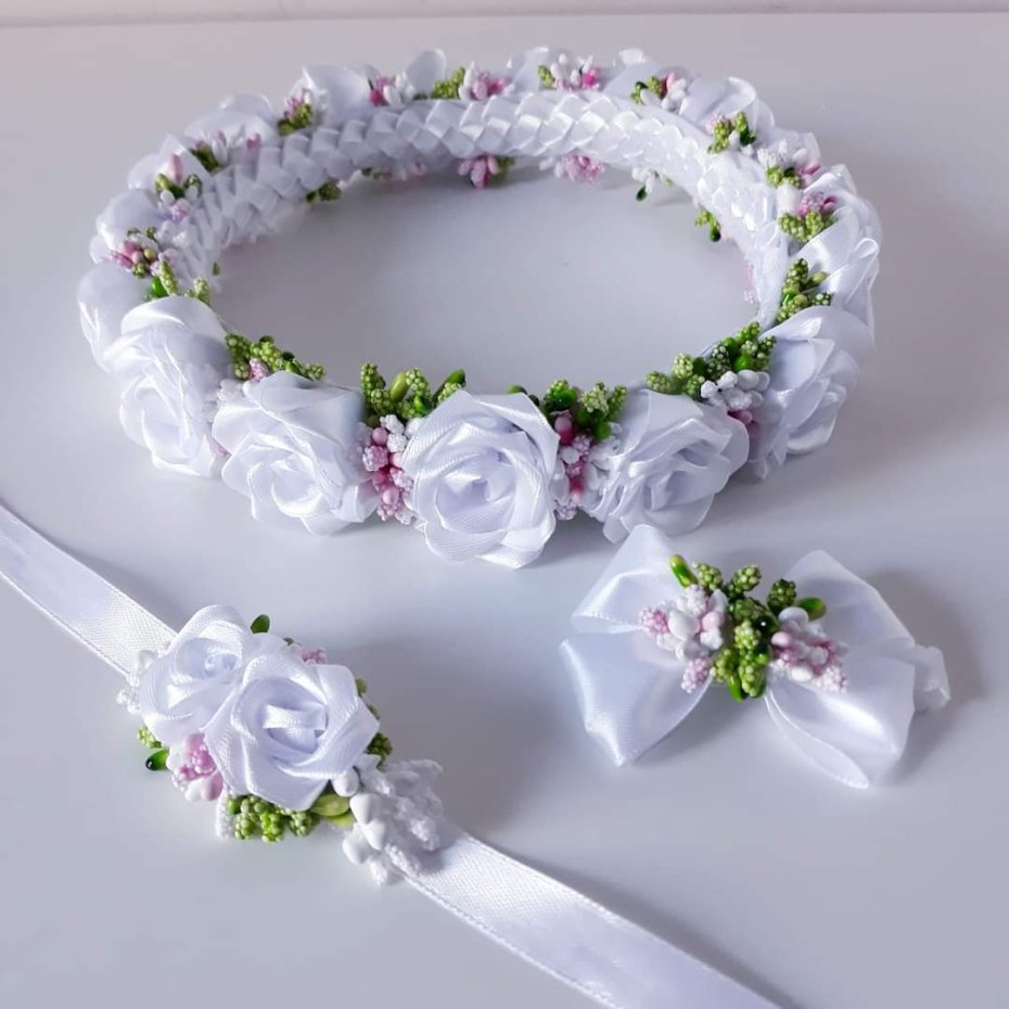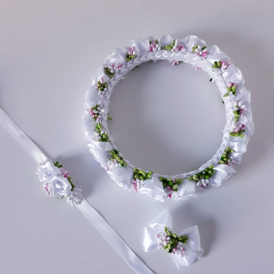 Piękny, ręcznie robiony wianek z białych róż ze wstążki satynowej z kolorowymi pręcikami. Idealny na Pierwszą Komunię świętą. W komplecie ozdoby: na rękę i na świecę. Obwód wianka to 50cm ( plus/minus 1cm). Róże mają około 3cm - 3.5 cm średnicy, wystają (ich wysokość) na około 2cm - 2.5cm. Stroik na rękę na wstążce satynowej ma ok 7cm długości. Stroik na świecę na gumce, długość kokardki 6.5cm. Pręciki gipsowe w kolorach biały, różowy, zielony. Podstawa wianka to cieniutki drucik, owinięty białą wstążką satynową. Róże umocowane na białym filcu, na około od środka oklejone ozdobnie złożoną wstążką satynową.