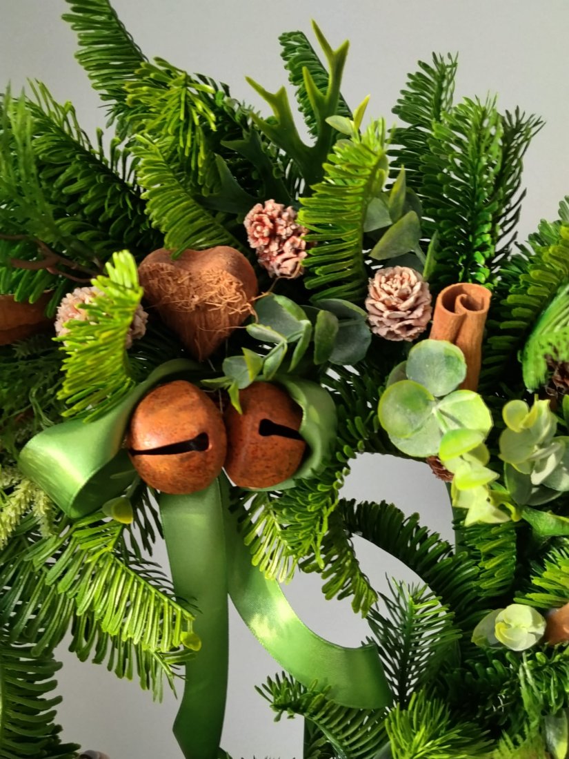 Wianek pełen lasu - w najpiękniejszym odcieniu mchu, zdobiony szyszkami, cynamonem. Wykonany z materiałów wysokiej jakości o naturalnym wyglądzie. Świetnie sprawdzi się już jako dekoracja jesienna.
