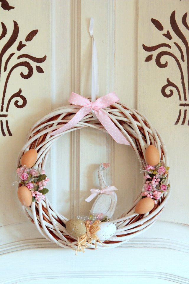 Świetny wianek na drzwi wykonany ręcznie. Pobielony z sympatyczną gąską:) Delikatny w pastelowej kolorystyce.