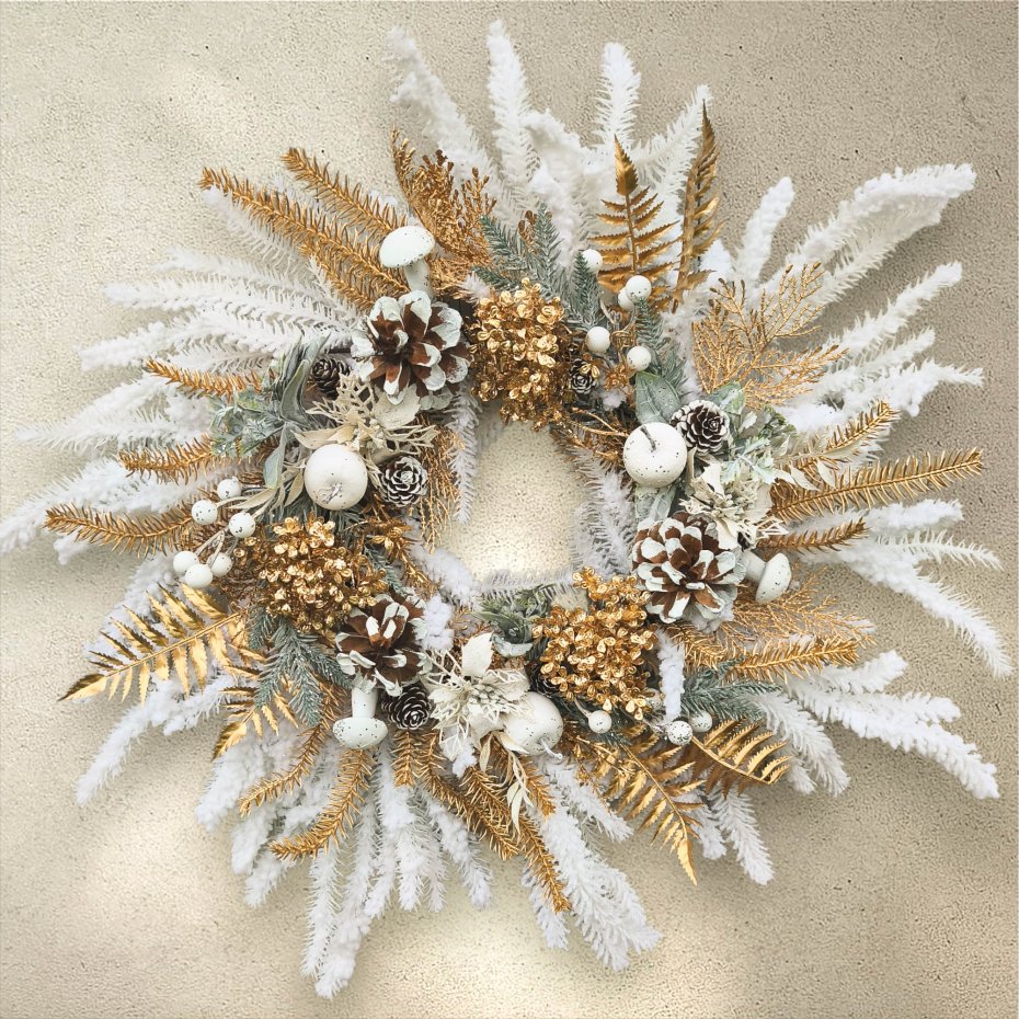 Wyjątkowy wianek świąteczny w eleganckiej, zimowej stylistyce.Połączenie śnieżnobiałych sztucznych gałązek, złotych liści oraz naturalnych szyszek tworzy kompozycję pełną blasku i świątecznego uroku. Idealny na drzwi lub jako świąteczna dekoracja wnętrza. Wianek o średnicy ok. 55cm.